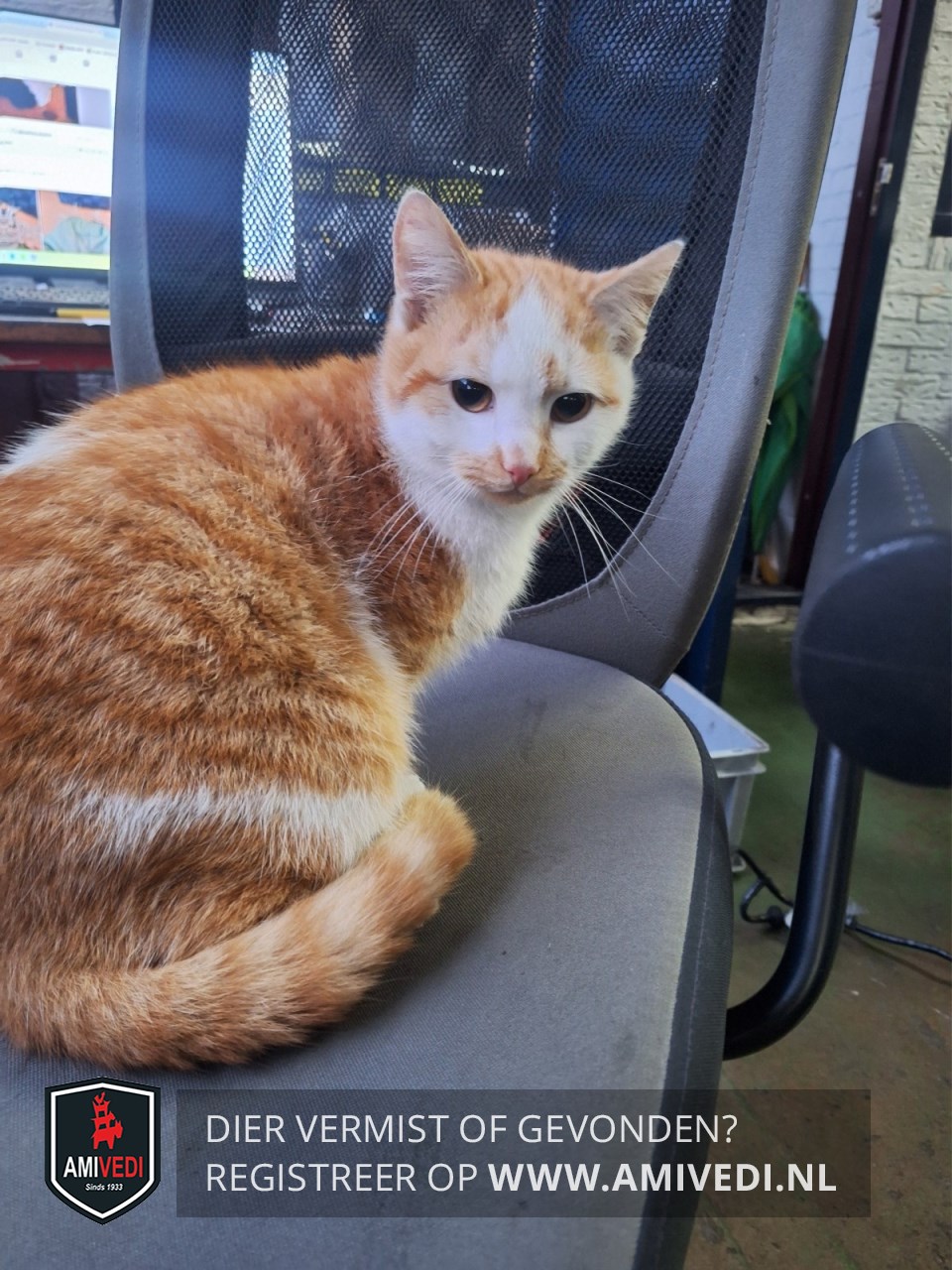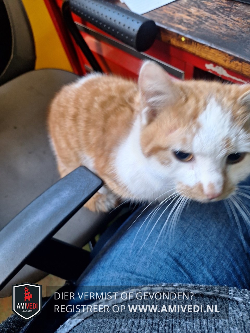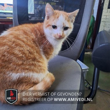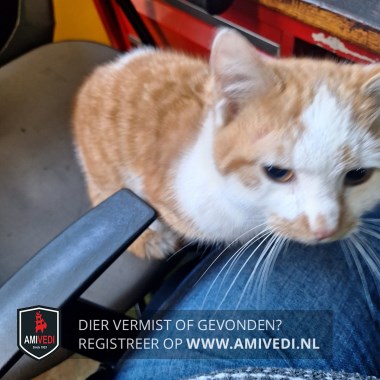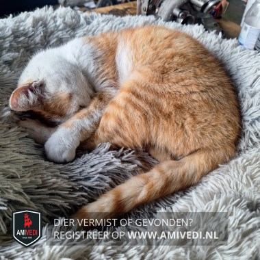 | Signalement | Cypers rood met wit. Wat oranje snoet. Voornamelijk witte neus met een oranje vlekje. Witte wangen. Witte bles. Witte bef en borst. Op de rug een witte vlek. Bij rechterheup een witte streep. Witte kraag. Deels witte onderpootjes. Klein van postuur. Erg aanhankelijk. Leeftijd is een schatting. |