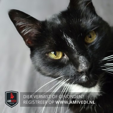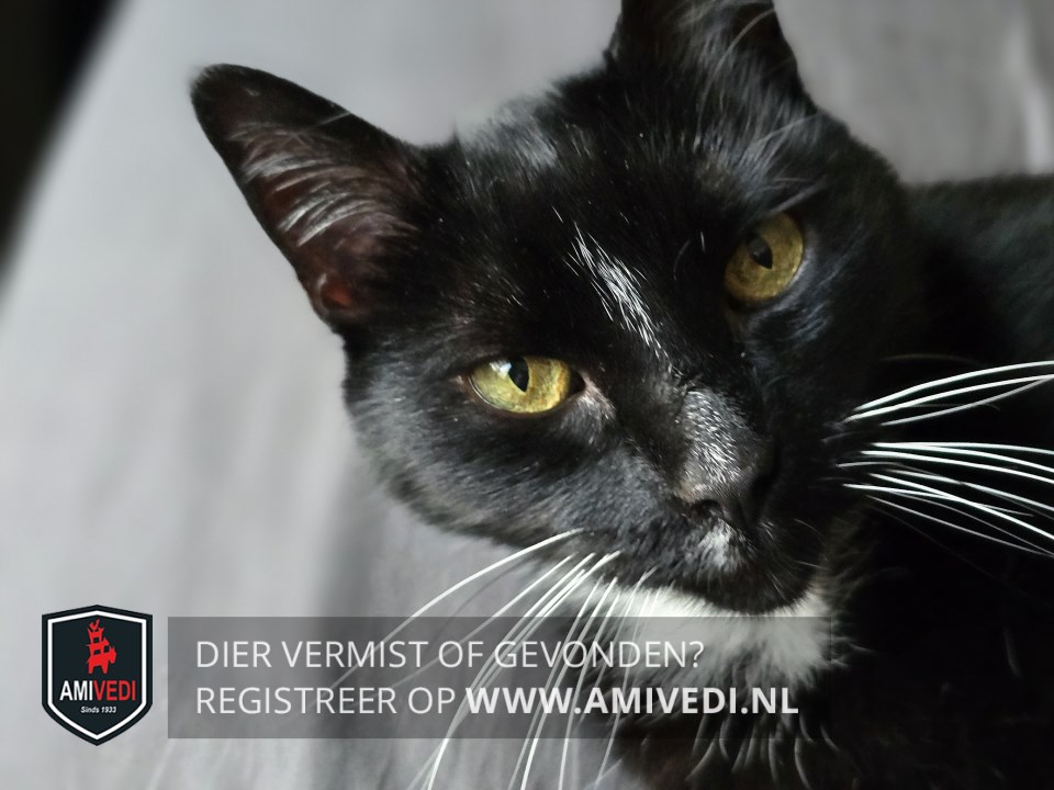 | Signalement | Zwart met dunne witte bles, wit stipje op de neus wit vlekje rechter bovenlip, witte keel, bef, borst en witte voetjes. *Kat is dieet behoeftig ivm blaasgruis. |