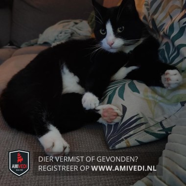 | Signalement | Zwart/wit. Voornamelijk zwart met wit tussen zijn ogen, wit op zijn wangen en een witte kin. Witte hals. Witte voetjes aan zijn voorpoten. Witte buik. Witte sokjes aan zijn achterpoten. Hij heeft een chronische ontsteking aan zijn linkeroog. |