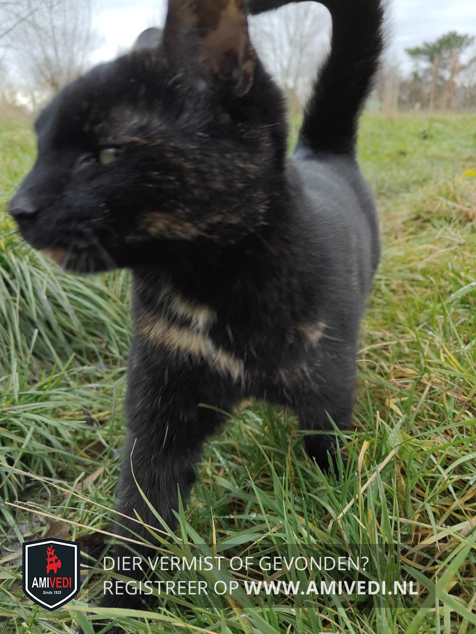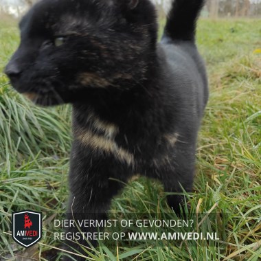 | Signalement | Kleine schildpadpoes. Voornamelijk zwart met beige/lichtrode vlekjes op het kopje, kin en strepen op de borst. |