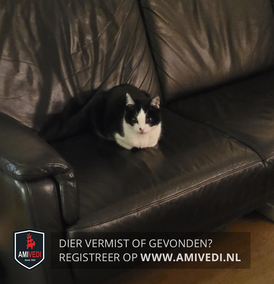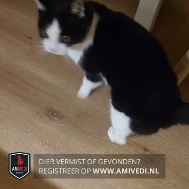 | Signalement | Wit tussen de ogen, neus, mond, kin, bef, borst en buik. Rechts op/boven de neus een klein zwart vlekje. Linker voorpoot witte laars. Andere 3 poten wit. |