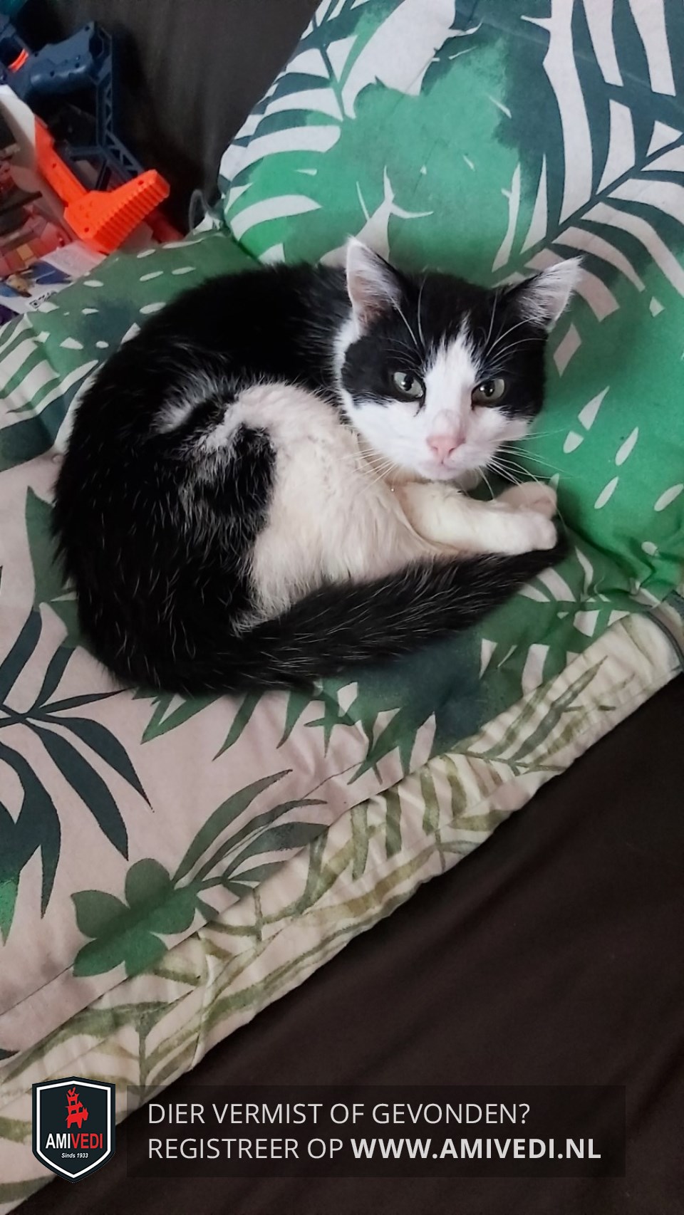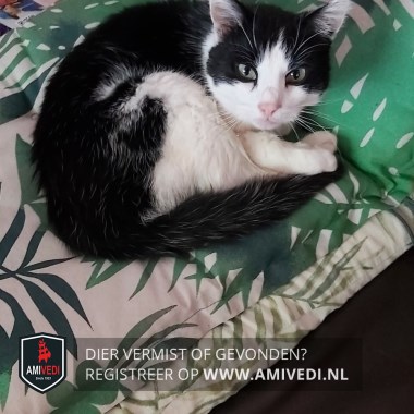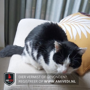 | Signalement | Zwarte kat met witte snuit,kin, bef, nek, borst, buik en pootjes. |
