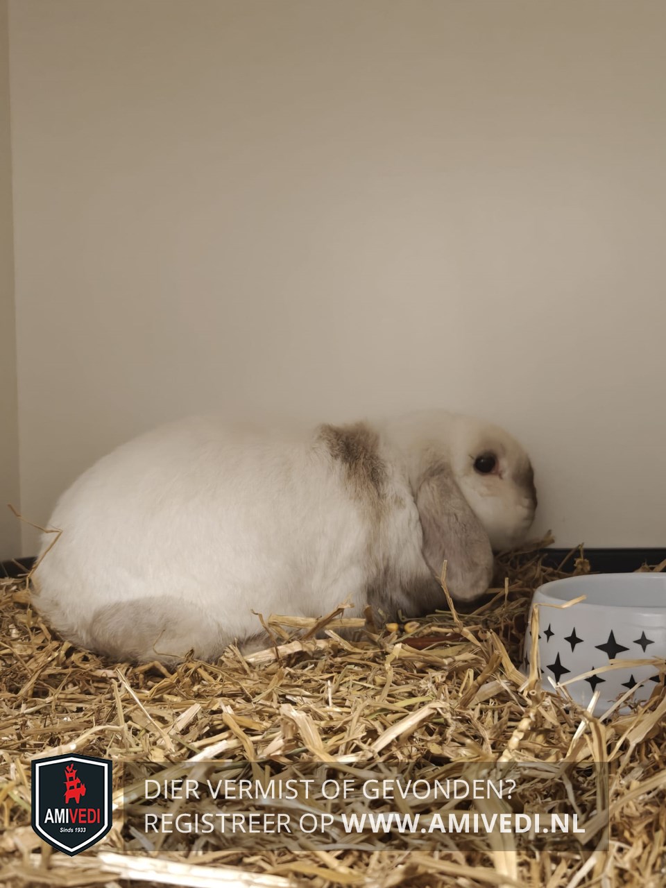 | Signalement | Duits hangoor konijn, zwarte ogen met een rode rand om oog, bruin in oren en boven nekvel, verder wit |