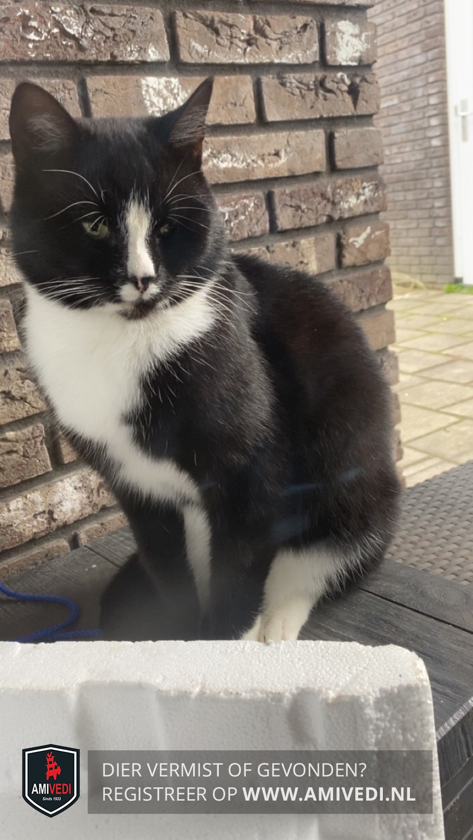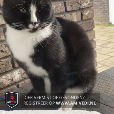 | Signalement | Zwart met wit. Witte streept over neus en wit onder neus. Zwarte vlekje op de neus. Witte hals, bef, borst, buik ( in het midden zwarte vlek) Voor pootjes witte voetjes, achterpootjes wit. |