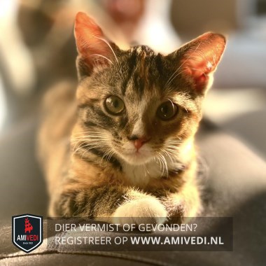 | Signalement | Cypers bruin/zwart gestreept met wat wit op het neusje, witte snoet, kin en bef. Rechter voorpootje wit voetje. |