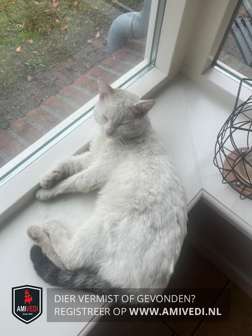 | Signalement | Wit met een cypers grijszwart geringde staart. Kent de omgeving niet. |