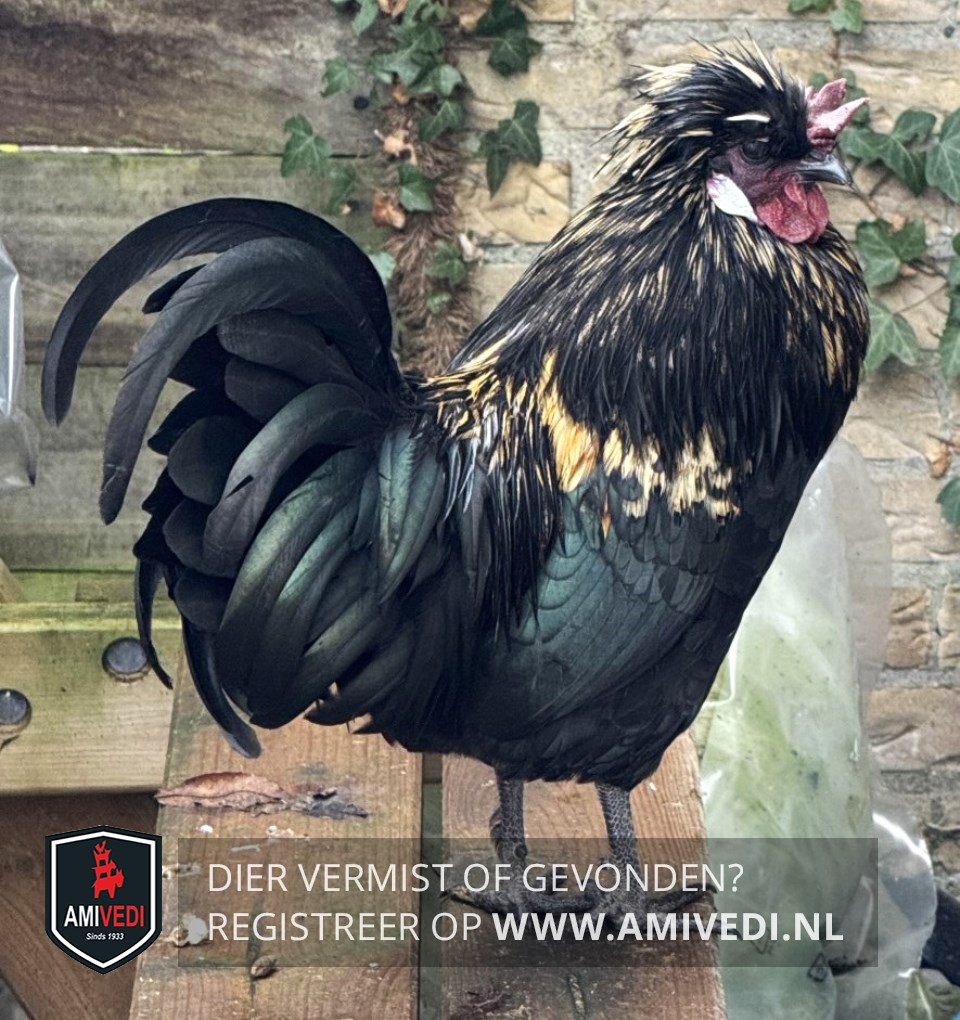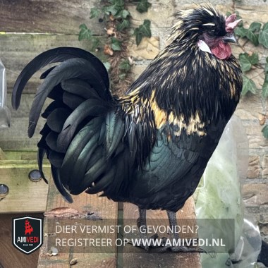 | Signalement | Zwart/blauw met bruin gemêleerd. Voornamelijk zwart met blauwe gloed, kuif zwart met bruin gemêleerd, rond de nek zwart met bruine highlights, onderaan bij de rug bruine vlekken, rode lellen. Haan. |