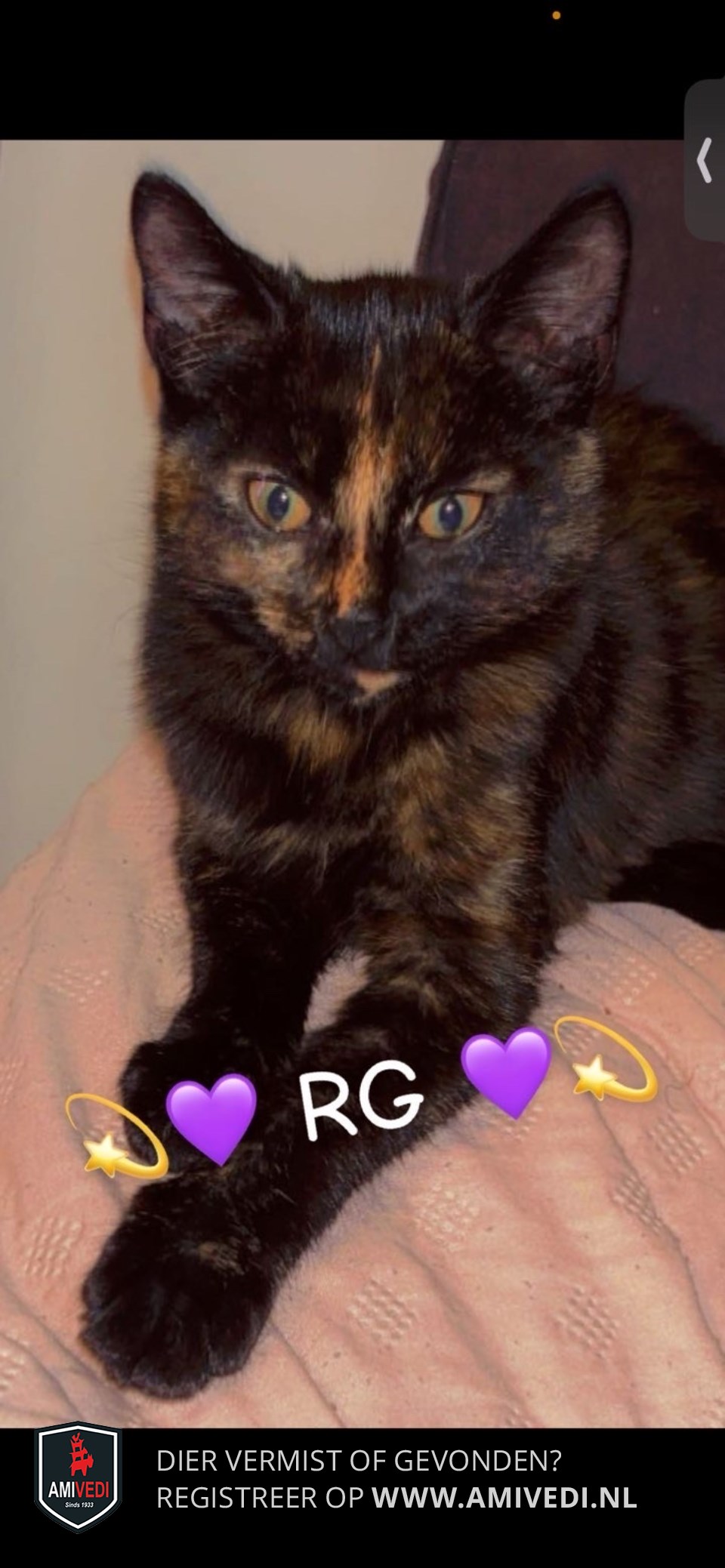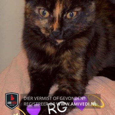 | Signalement | Schildpad, zwart, rood/oranje, golven door vacht, opvallende oranje streep op voorhoofd die doorloopt tot aan neus, beige kleurig op achterpoot. |