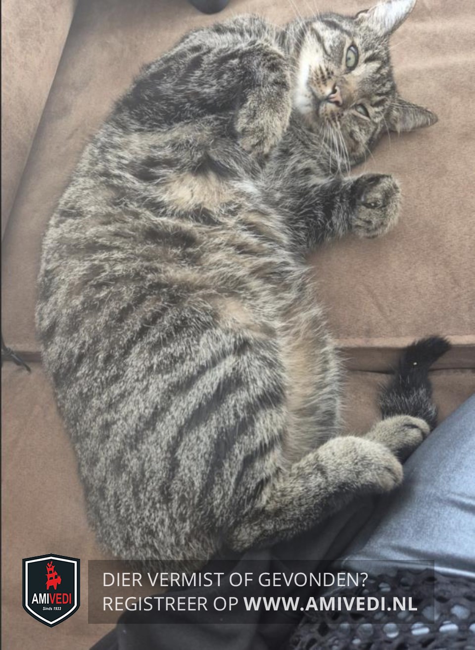 | Signalement | Bruin/zwart cypers met wat wit. Hoofdzakelijk Cypers. Witte kin. Rossige neuspunt. |