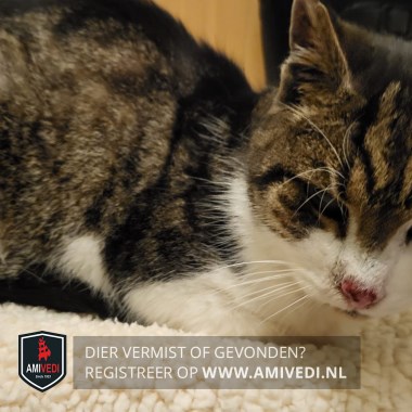 | Signalement | Bruin/zwart/wit Cypers. Witte snoet, kin, bef en borst. Cypers vanaf de ogen op de kop, rug en staart. (ranke oudere kater). Draagt een zwart met groen bandje. |