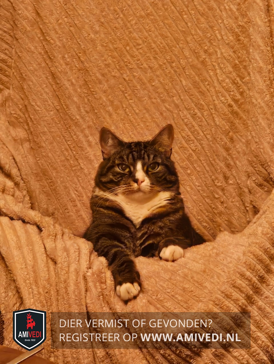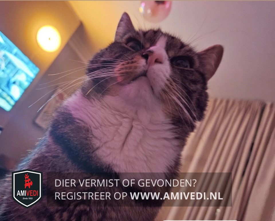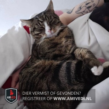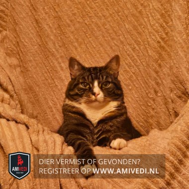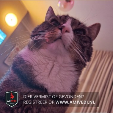 | Signalement | Het is een kruising tussen een Europese korthaar en een Main Coon, wit in snuitje re. op neus en bovenlip, witte kin / hals / bef /sokjes, zwart vlekje re. neusopening. |