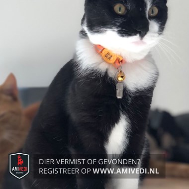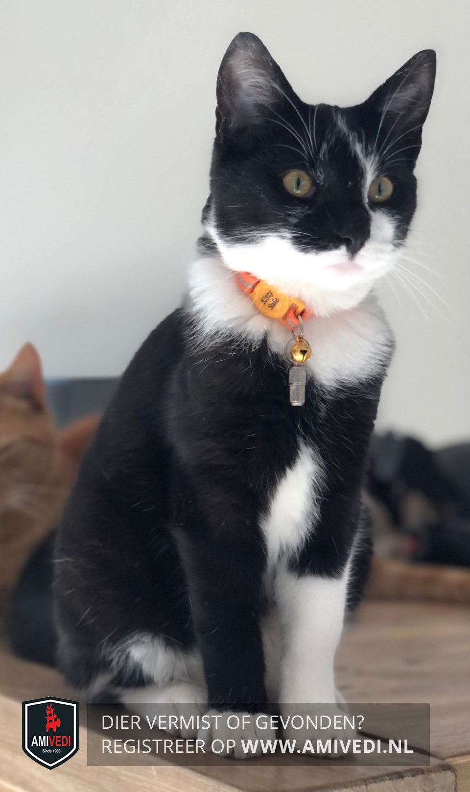 | Signalement | Zwarte kater, halsbandje met belletje en embleempje, Kopje rond oortjes en oogjes zwart. Zwart neusje en rechts neusje zwart. Links van neusje wit. Een witte verticale streep van linkeroogje naar boven.Beneden neusje wit. Witte kin en hals en kraag. Wit op buik. Rechter voorpootje wit sokje en linker voorpootje wit laarsje. Rug en staart zwart met wit puntje. Achterpootjes wit. Oranje bandje op foto heeft hij niet meer om Kat is nu groter dan op de foto! |