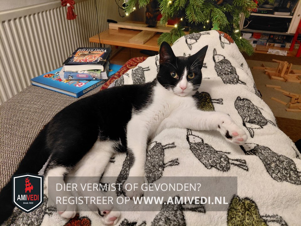| Signalement | Zwart met witte bles, snuitje, kin, keel, hals, bef, borst witte poten (rechtsvoor een zwarte vlek achterzijde poot), en linksachter wit poot, rechtsvoor witte kous. |