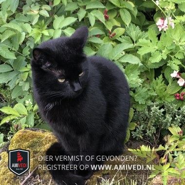 | Signalement | Egaal zwart, paar witte haartjes onder de kin. |