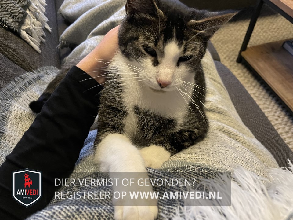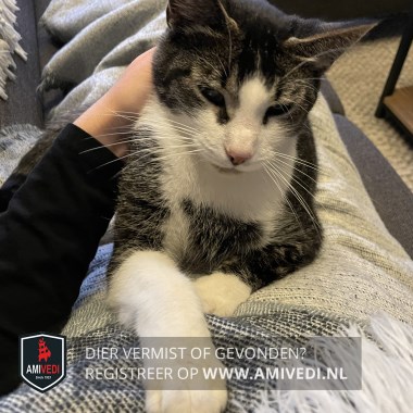 | Signalement | Cypers grijs en wit. Witte snoet met witte neus. Witte bles. Duidelijke traanstrepen. Bovenop kopje voornamelijk zwart. Witte kin, bef en borst. Rechter voorpoot wit en links heeft hij een wit sokje. Is vrij smal met een klein kopje. |