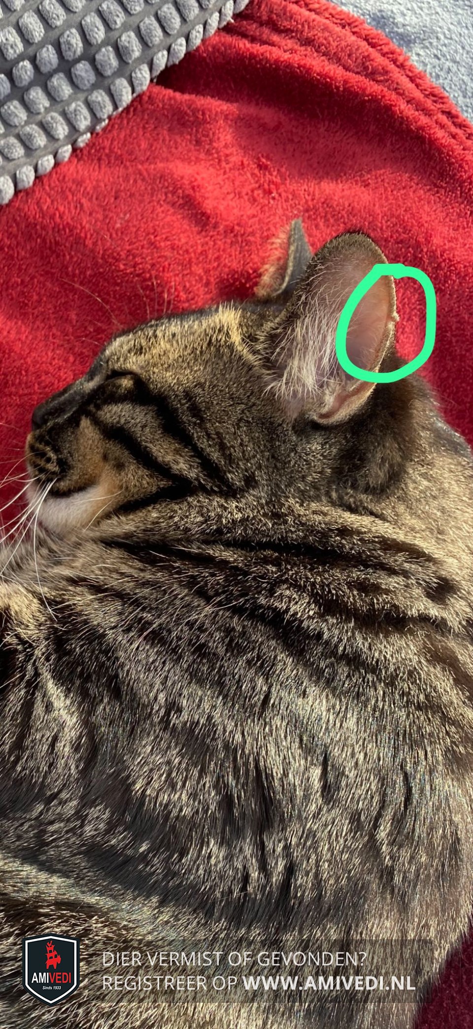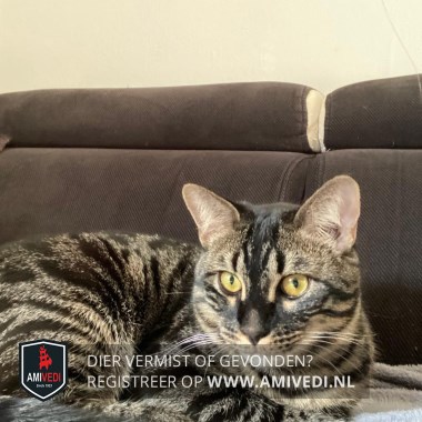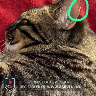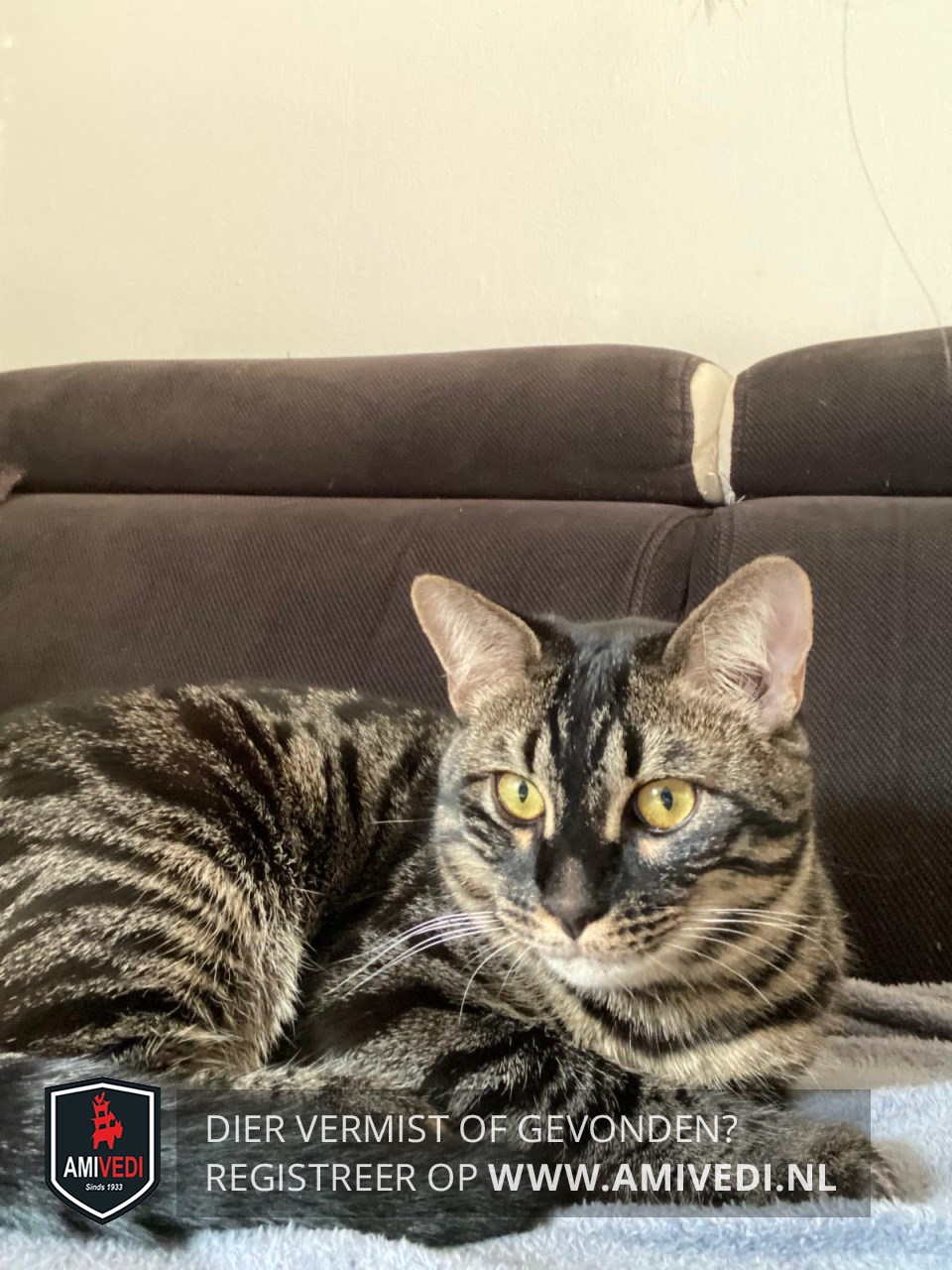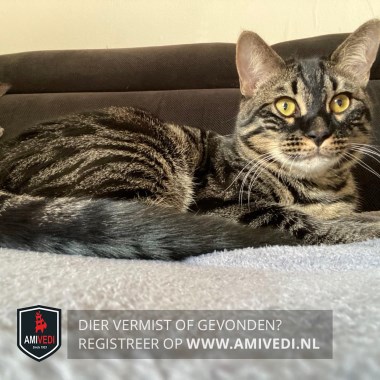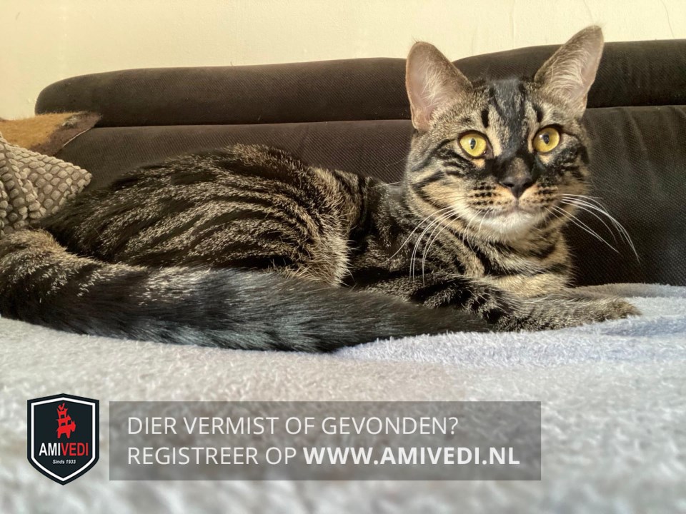 | Signalement | Grijs/zwart (gestreepte) kater met bruine ondertoon, kruising met Bengaal, zwarte neus met bruin puntje, over het hele lijf zwarte strepen en vlekken, klein stukje uit het linkeroor. |