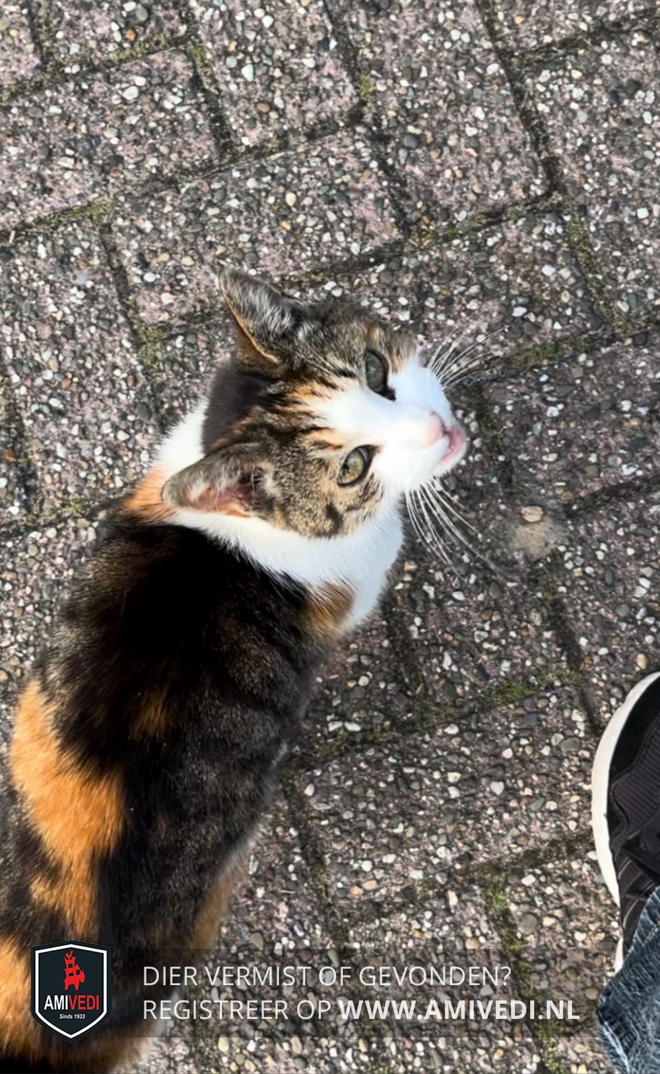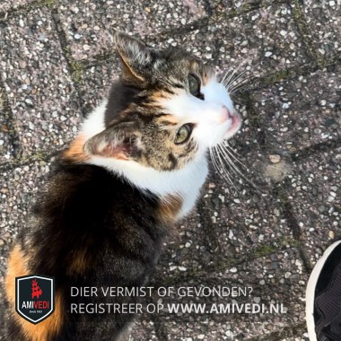 | Signalement | Cypers bruin/zwart (paar oranje/rode gestreepte vlekken) met wit. Tussen de ogen wit, wir rondom neus, mond, kin bef en borst. Vanaf schouder hoogte loopt wit vanaf onderzijde lichaam als een band over de rug. Linkerzijde onderrug een grote rood/oranje vlek. Heeft op haar onderrug een ruwe plek op haar huid (pluk vacht los). Beetje doof door ouderdom en houdt van warmte /slaap. |