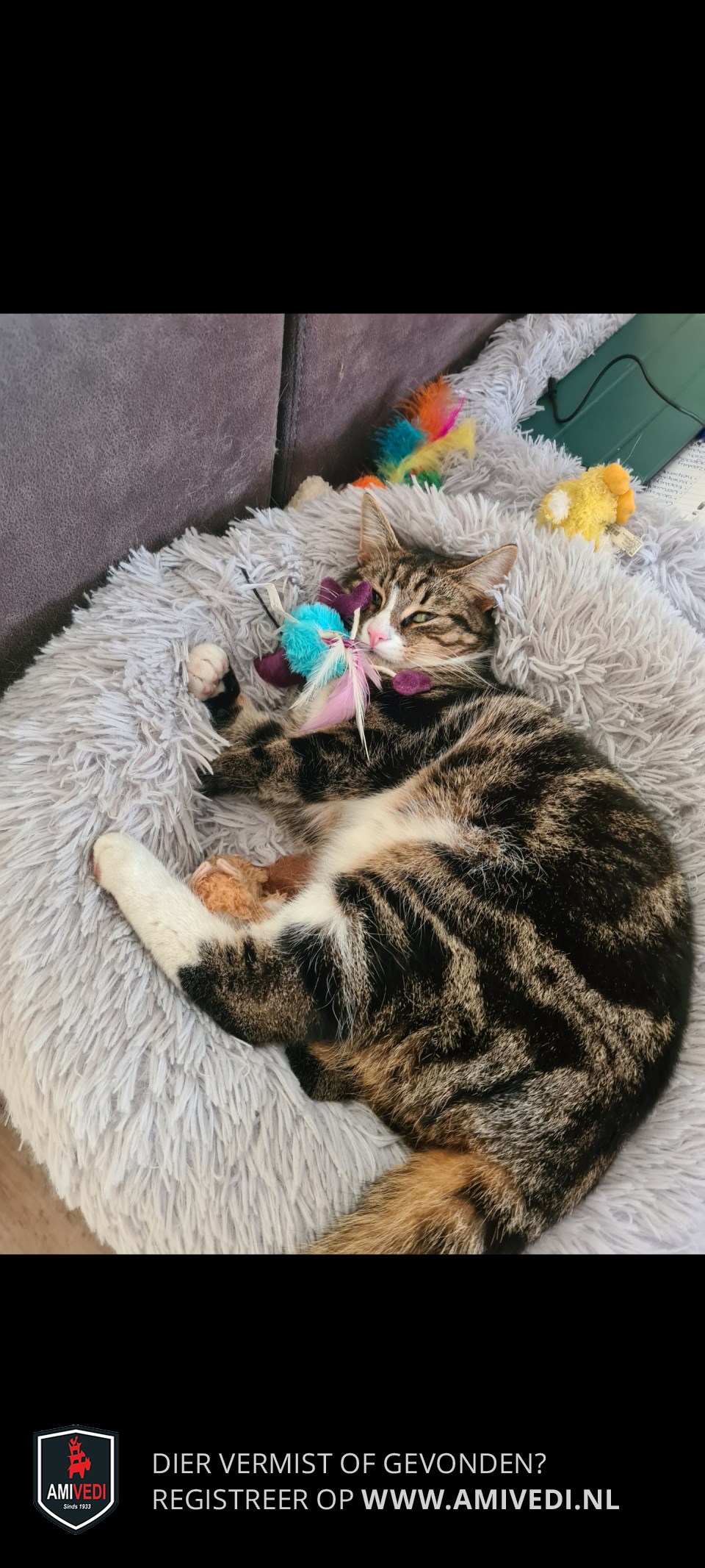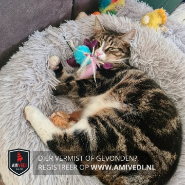 | Signalement | Tijgerkopje, roze neusje en wit blesje Grijs/wit/zwart gestreept maar ook een paar oranje/bruin vlekjes bij staart en achterpoot, andere achterpoot wit. |