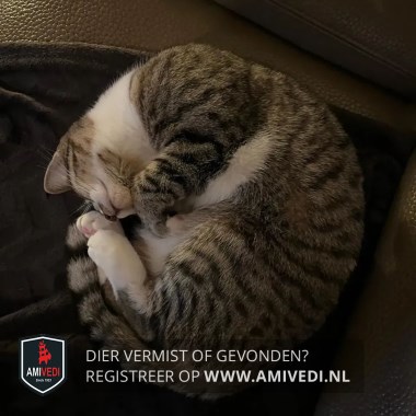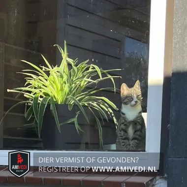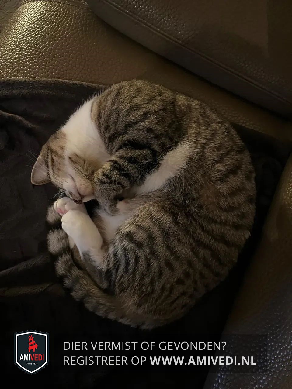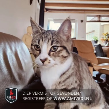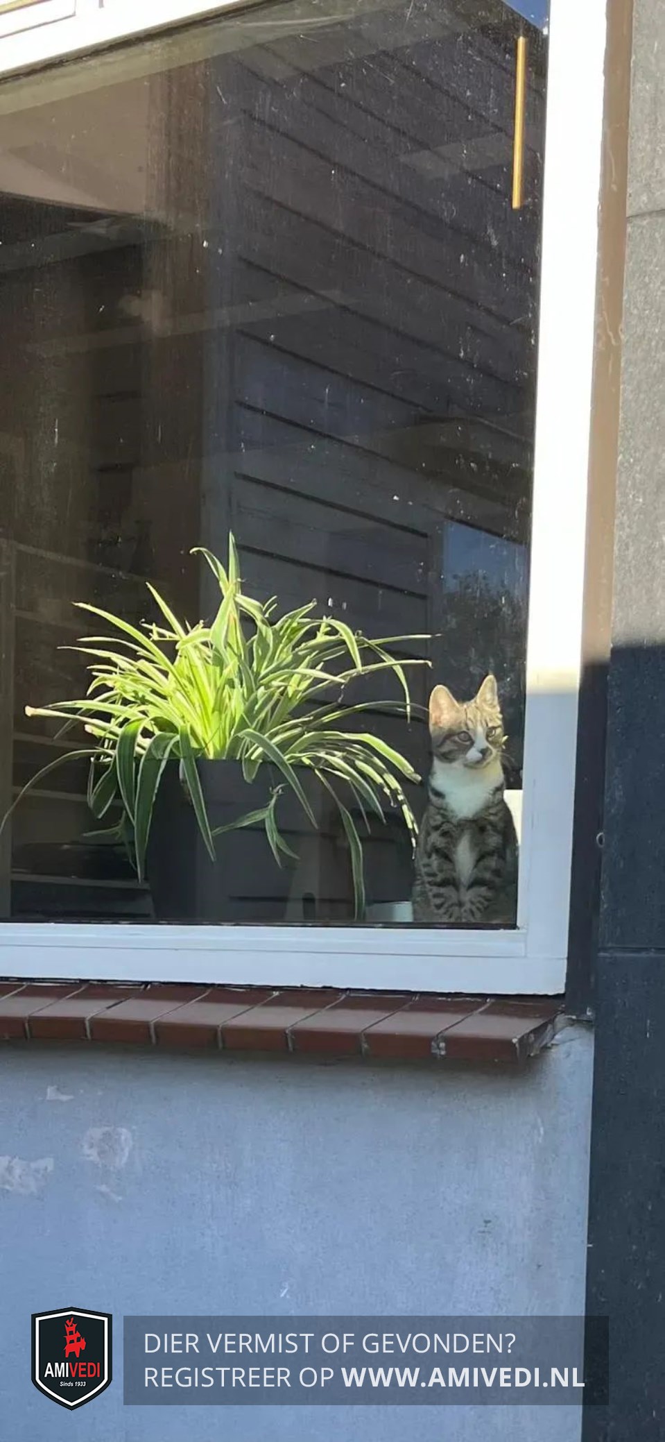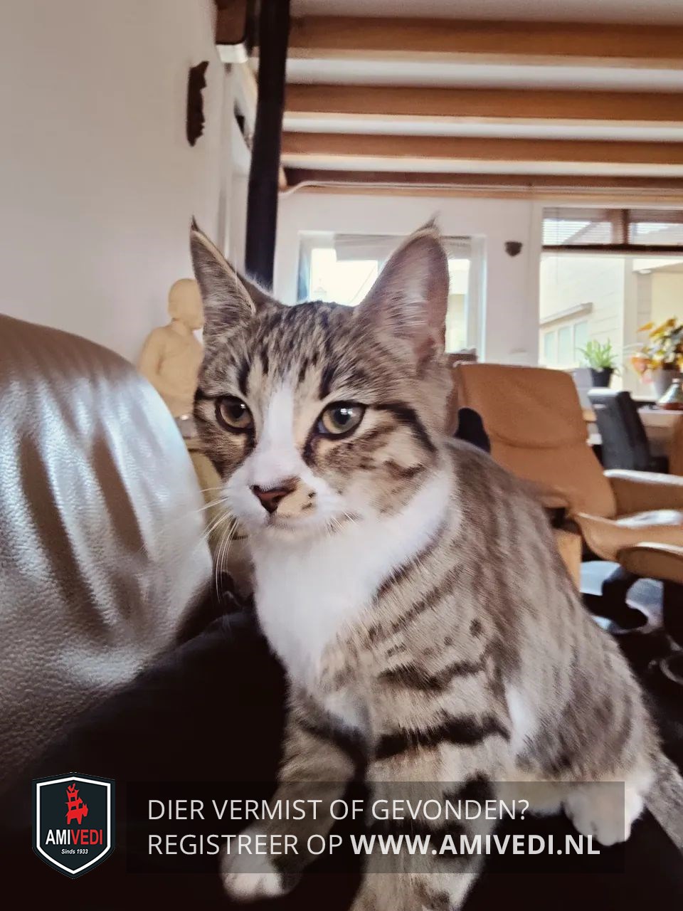 | Signalement | Bruin/grijze gestreepte kat. Witte kraag, wit snuitje en witte pootjes. Bruin/gele ogen. Nog niet volledig volgroeid. |