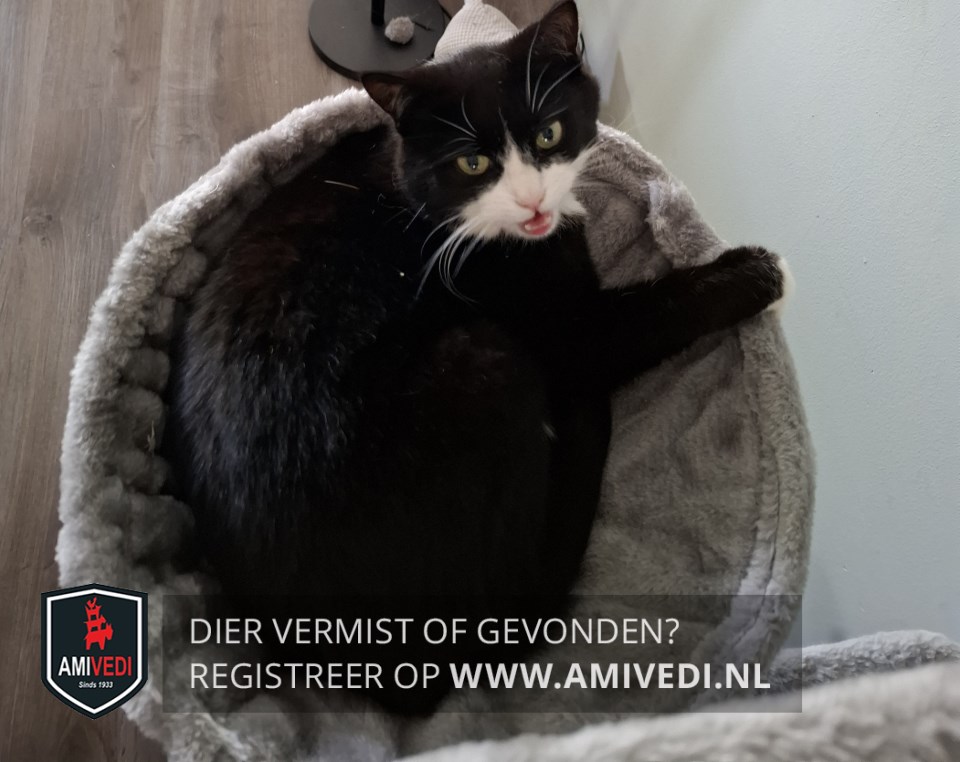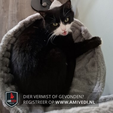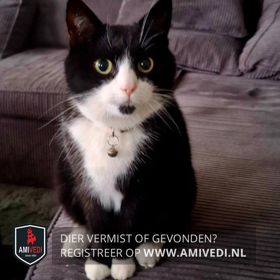 | Signalement | Klein zwart met witte poesje wit snuitje met zwart vlekje aan haar kin. Zwart rond de ogen en zwarte oren, Witte borst. Voor witte voeten. Zwarte rug en staart. |