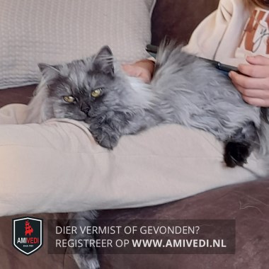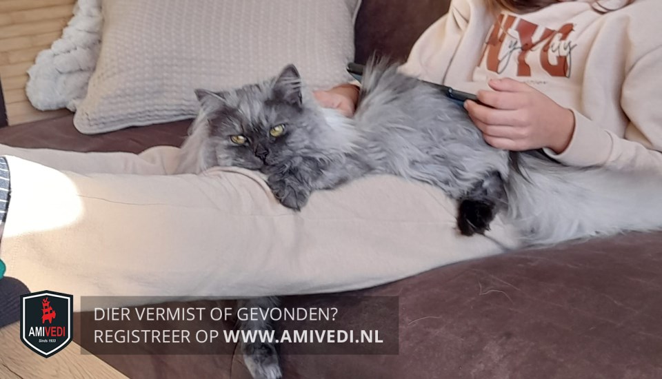 | Signalement | Grijs/zwart smoke gemêleerde vacht. Het snuitje is donkergrijs/zwart. Linkerachterpoot heeft een zwart voetje. |