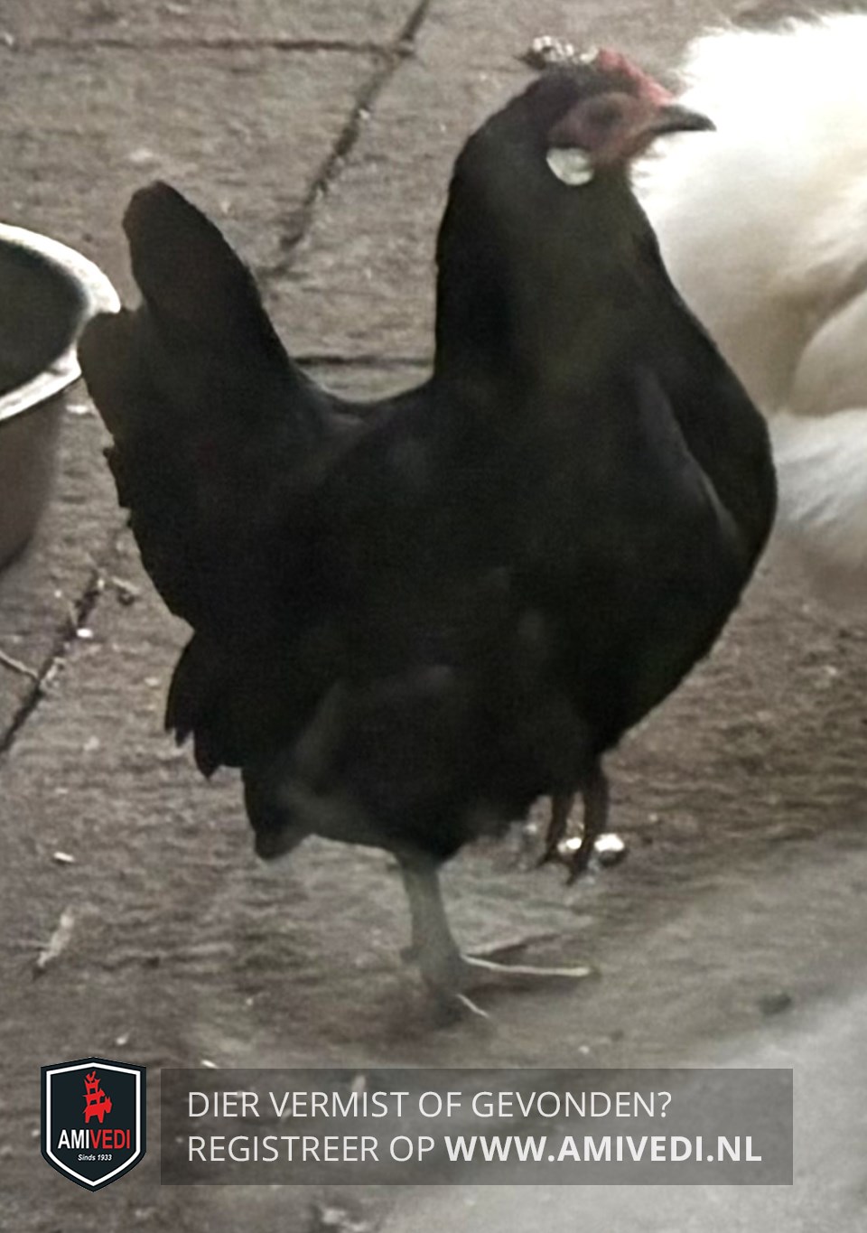| Signalement | Zwart met wit. Geheel zwart met witte rondjes op beide wangen. Klein kipje. |