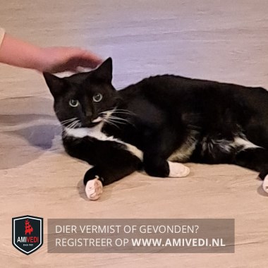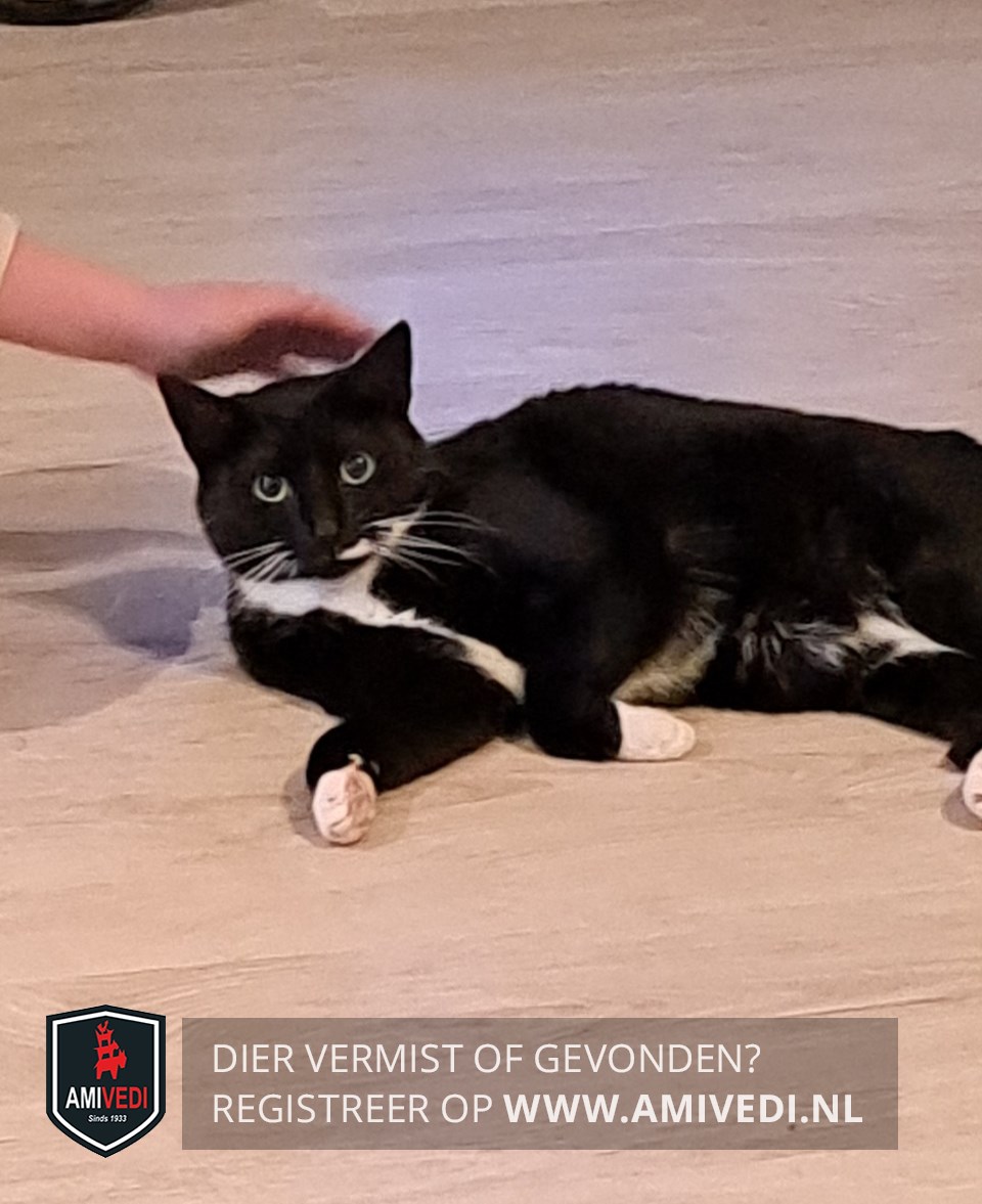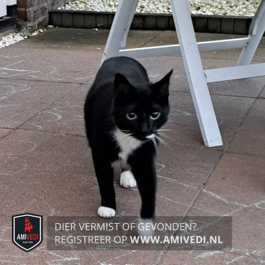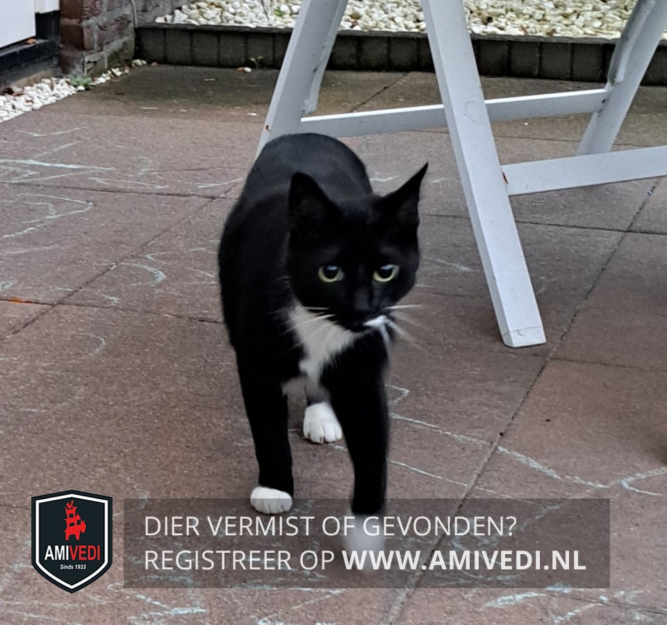 | Signalement | Zwarte kat met witte bef, beetje wit op borst en buik. Witte streep naast zijn bek. Voorpootjes hebben witte voetjes. Achterpootjes hebben ook wit. |