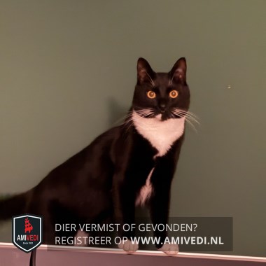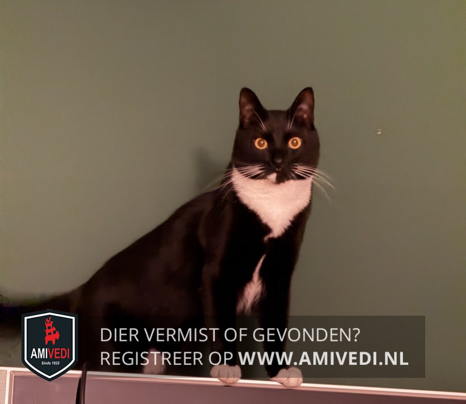 | Signalement | Egaal zwarte kater met witte snorharen en een brede witte bef, beetje wit aan de buik. Zwart lijf en zwarte pootjes met aan de voorpootjes witte teentjes en aan de achterpootjes witte sokjes. Witte stip aan de rechterkant van zijn kin. |