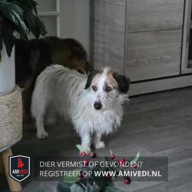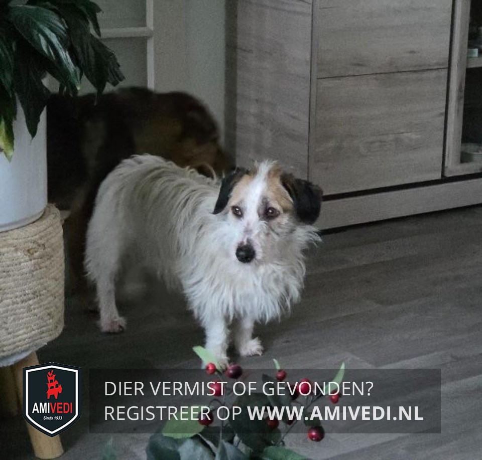 | Signalement | Witte langharige teckel kruising. Bruine oren. Laat zich niet vangen |