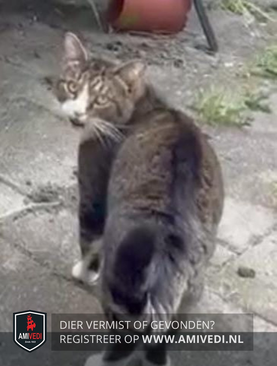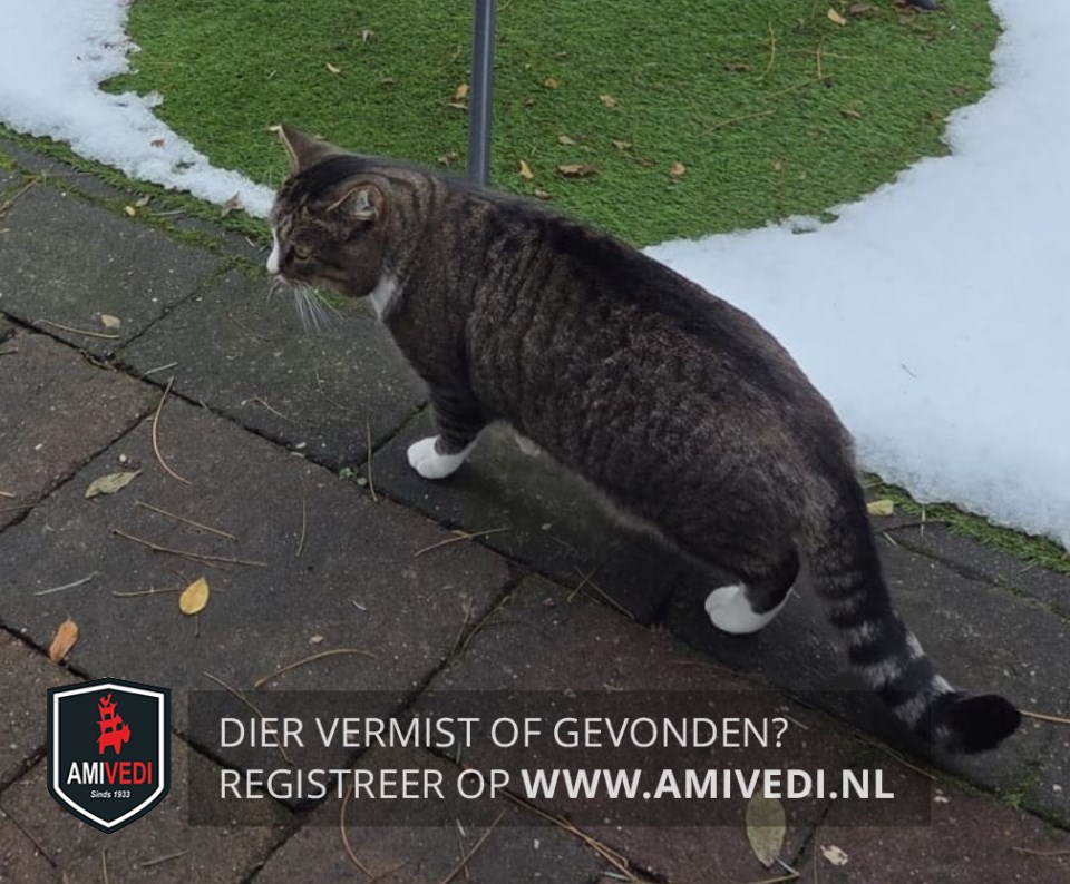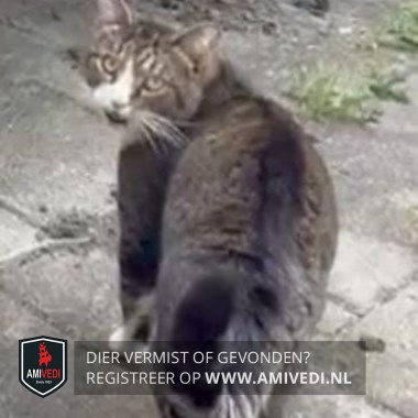 | Signalement | Cypers grijs/bruin/zwarte kater. Zwarte baan midden over de hele rug. Wit neusje en wit snorretje. Wat grijs rondo het bekje. Wit op de rechter wang. Witte sokjes. Hele dikke nek. Duidelijk zwart/grijs gestreepte staart. Zwarte staartpunt. |