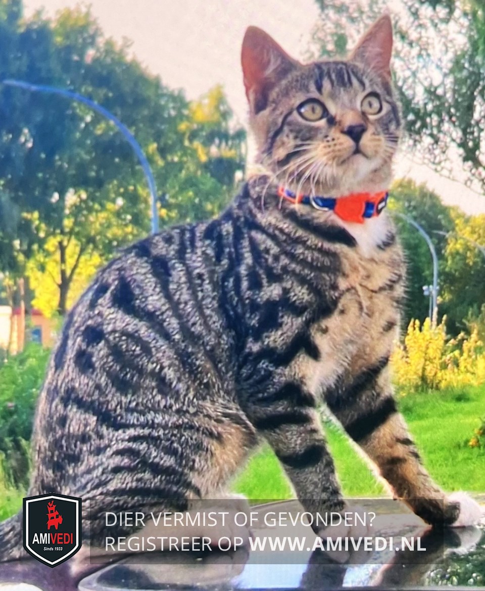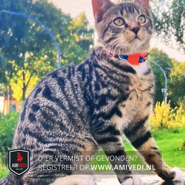 | Signalement | Cypers bruinzwart gestreept met wit. Voornamelijk cypers bruin, beige randjes rond de ogen, bruin op de neus, bruine snoet met daaromheen en beetje wit, roze neusje, kin wit, wit befje, beige op de borst, voorpoten witte tenen, beige bij de buik, achterpoten witte kousen, staart cypers geringd met een zwarte staartpunt. |