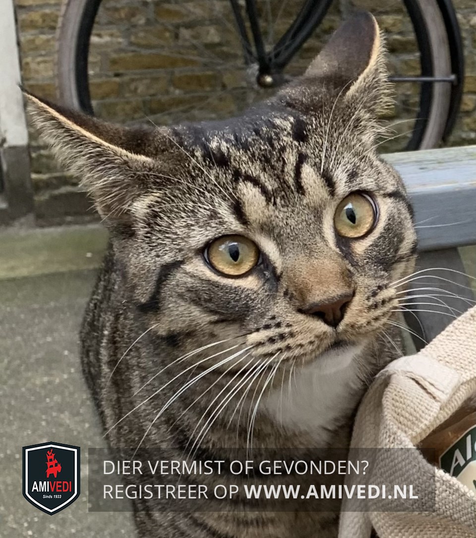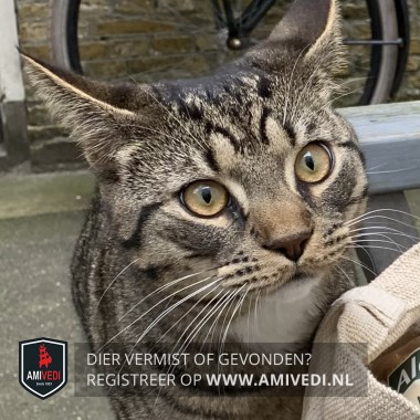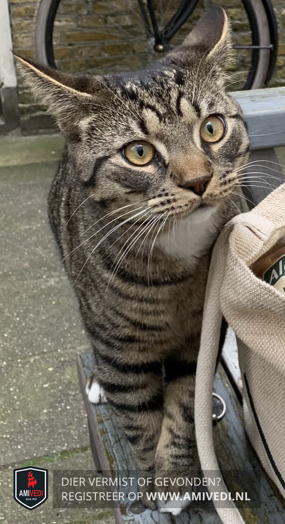 | Signalement | Cypers bruin-zwart met wit. Bij alle vier poten zijn de tenen wit. Witte kin en bef. Hij heeft aan twee kanten in nek een grote kale plek met wondje (allergische reactie vlooienband). |