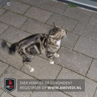 | Signalement | Grijs cypers gemarmerde tekening met wit. Witte bef. Voorpoten witte voetjes en achterpoten witte teentjes. |