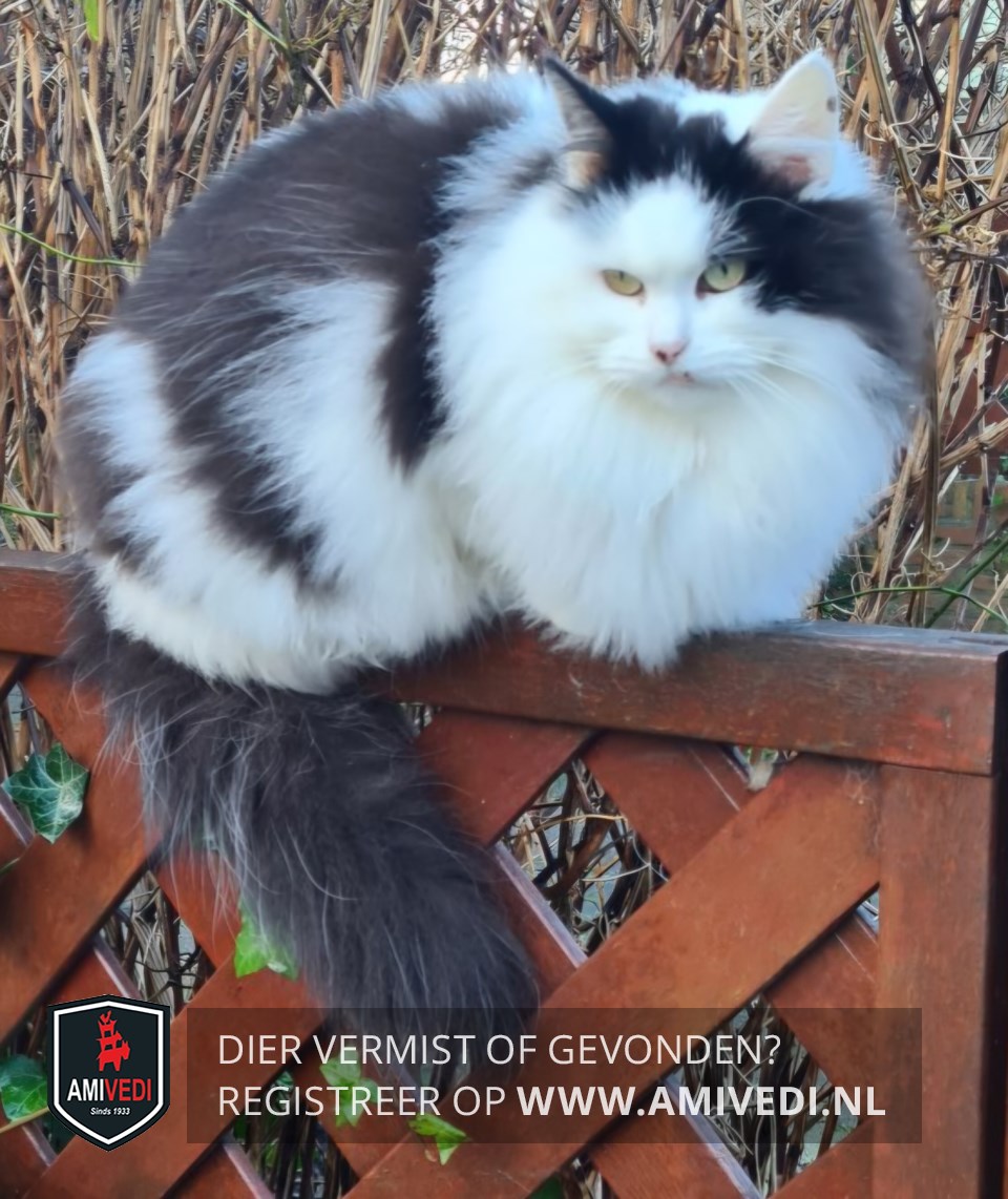| Signalement | Wit-zwarte half langhaar. Zwarte 'streep' over voorhoofd van rechter oor naar linker wang. Witte kop, borst, buik en poten. Over rug en flanken wit-zwart gevlekt. Zwarte staart met witte haartjes erdoor. Scheve voortand |