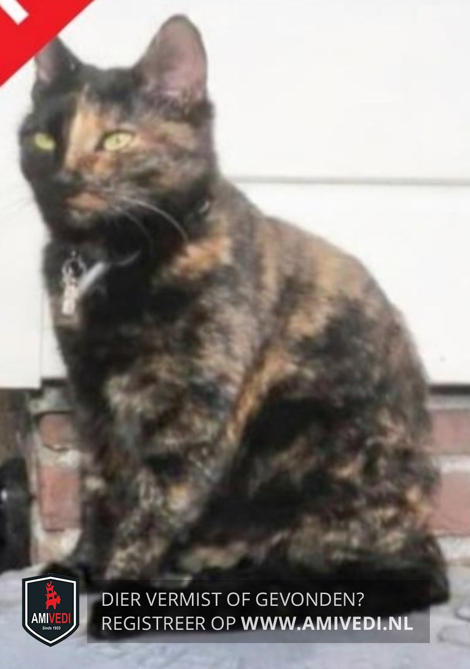 | Signalement | Zwart/roodbruin schildpad poesje. Linkerkant van gezichtje voornamelijk zwart. De rechterkant voornamelijk zwart roodbruine schildpadtekening. Roodbruin neusje met een zwart puntje. Hier en daar wat wit door de vacht heen. Klein postuur. Zwarte halsband. |