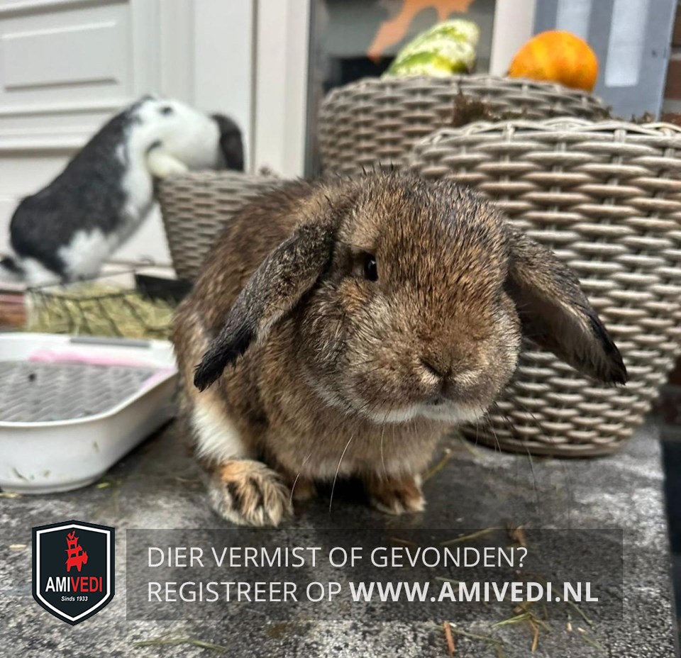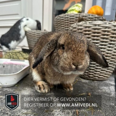 | Signalement | Hangoorkonijn, bruin gemelerd, wit onder de kin en onder de buik, lichtbruine pootjes. |