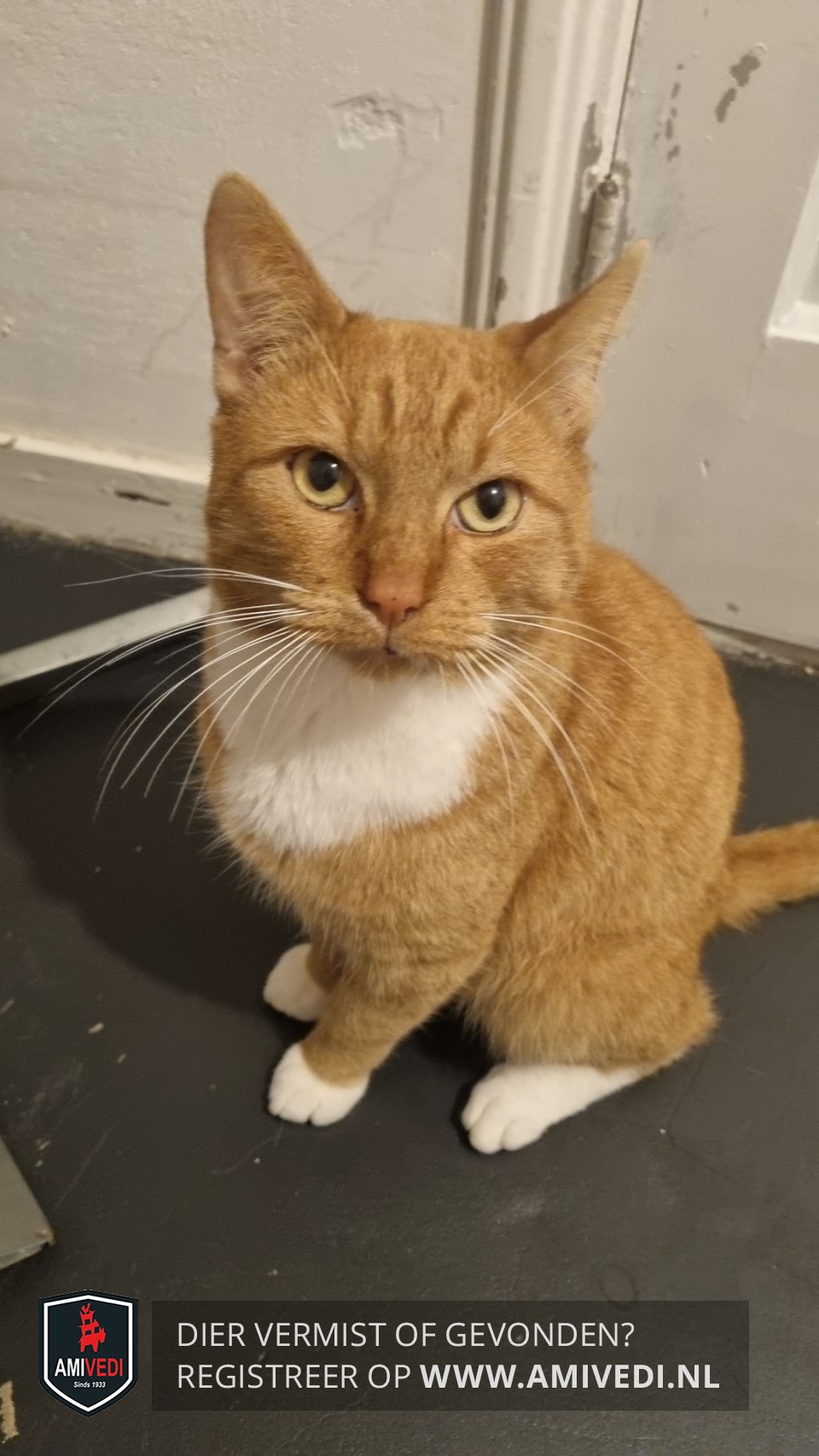 | Signalement | Dit is Ginger. Hij is Rood/oranje met een witte bef en witte voeten. Hij is nu al een paar maanden niet thuis gekomen. Hij heeft moedervlekken op zijn lip |