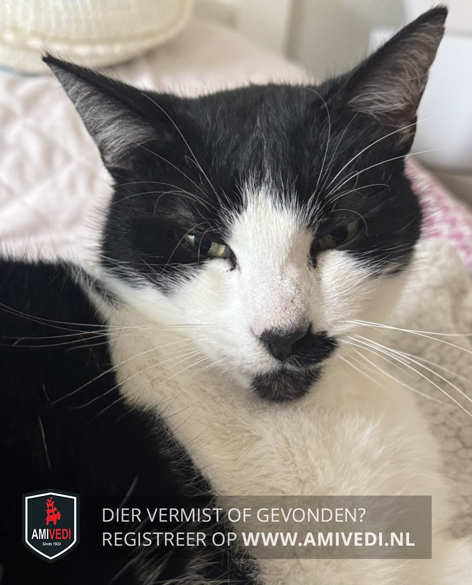 | Signalement | Te herkennen aan zijn vlekje naast zn neusje & kin die zijn zwart, zwart rondom de oren, witte neusbrug, witte borst, rug zwart. |