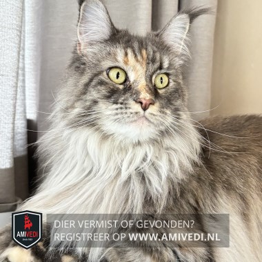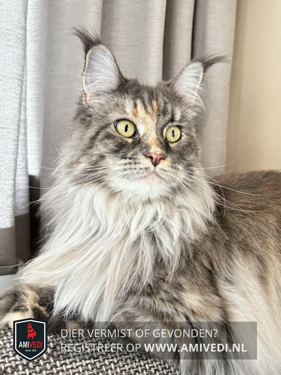 | Signalement | Maine Coon, hoofdzakelijk grijstinten tot aan wit met ook rode accenten: rechterhelft neusbrug tot boven het oog bijvoorbeeld; grote, langharige wittige bef; lijfje grijstinten met rood, meer gemêleerd. Buik is licht(er). LET OP: binnenkat! |