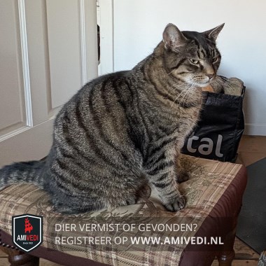 | Signalement | Flinke cypers bruin-zwart gestreepte kater, heeft een heel klein en smal litteken op z'n neus en iets wit onder zijn neus en een witte kin, zwart tussen de tenen en een geringde staart |