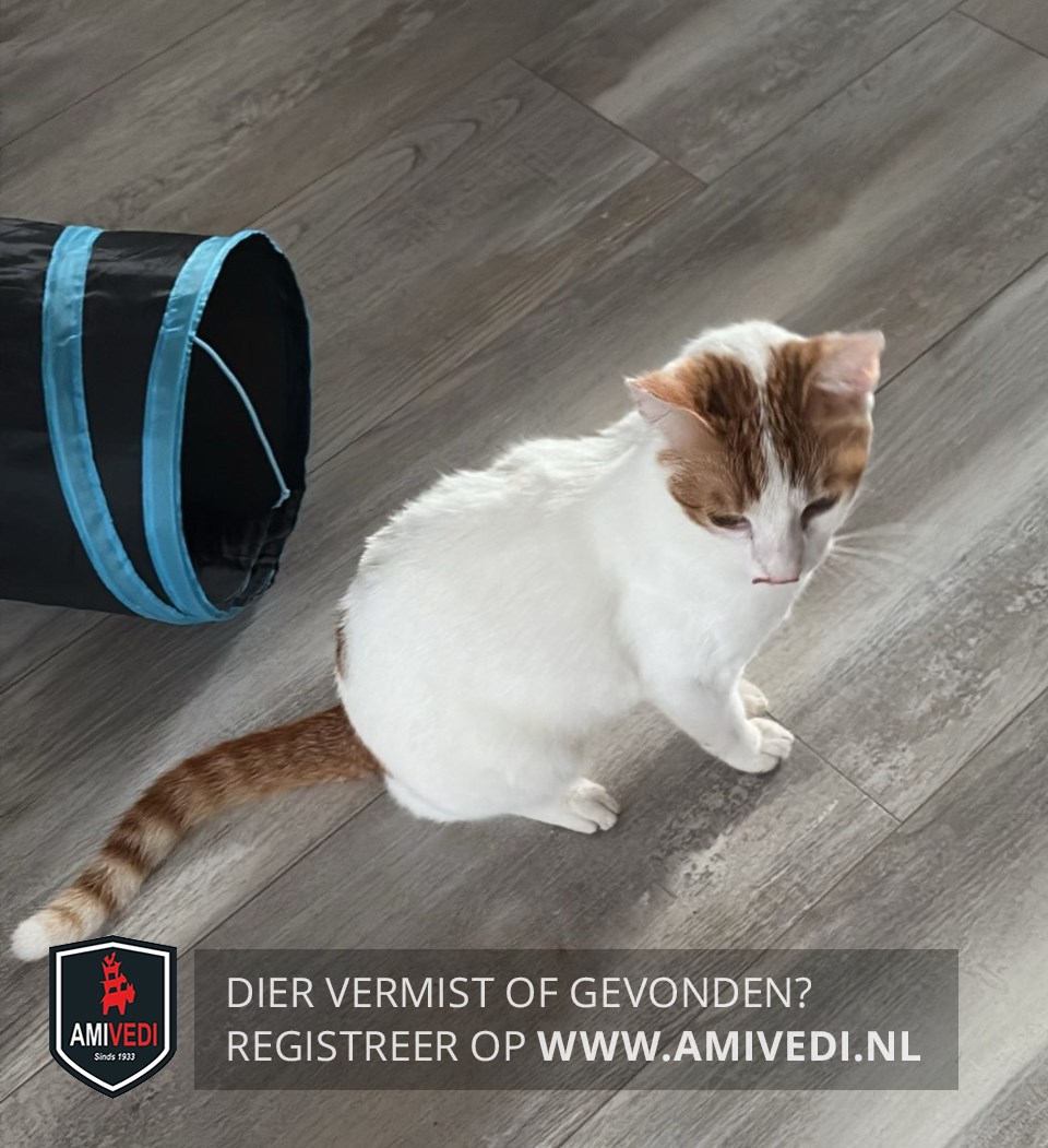 | Signalement | Witte kat met rood/ oranje vlekken op kopje en rug. Staart is rood/oranje gestreept met af en toe wat wits. |