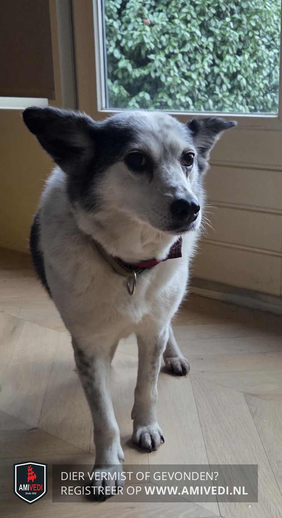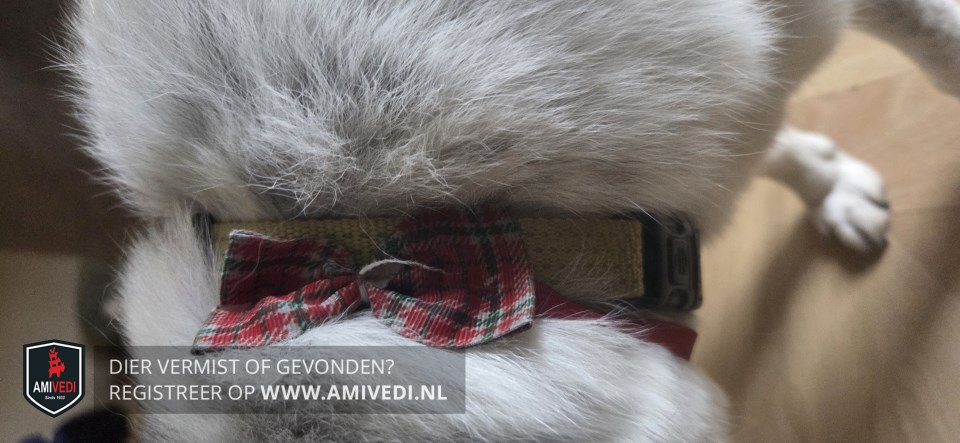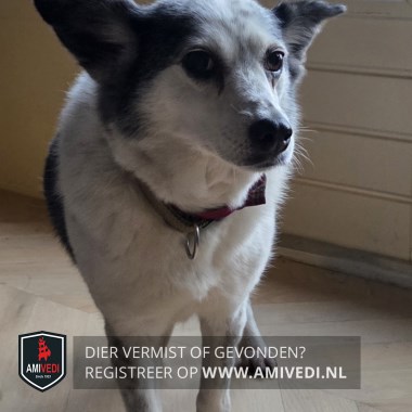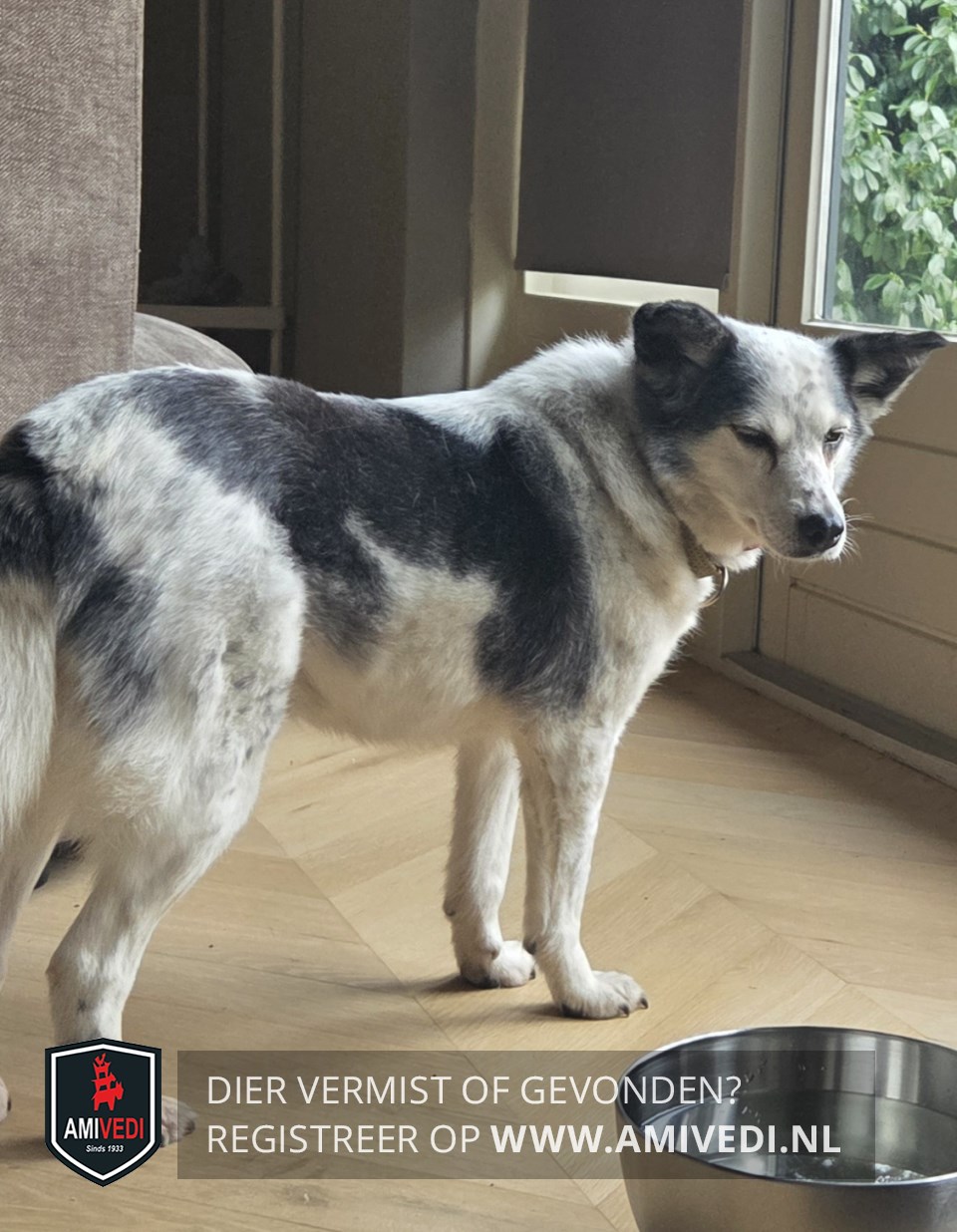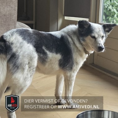 | Signalement | Kruising collie/aus.shepard type hond. Grijs/zwarte vlekken met wit Oren grijs/zwart gemeleerd, kop op de voorhoofd wat vale grijze kleine vlekjes, licht grijze waas in de nek achterop, witte kin, witte borst met wat licht grijze kleine vlekjes, witte voorpoten, witte buik, witte achterpoten met wat grijzige vlekjes op de flank, vanaf de rechterschouder langs rechterzij naar net voor de flank een grijze vlek, bij de staartaanzet een grijze vlek die even klein beetje doorloopt over rechter bil. |