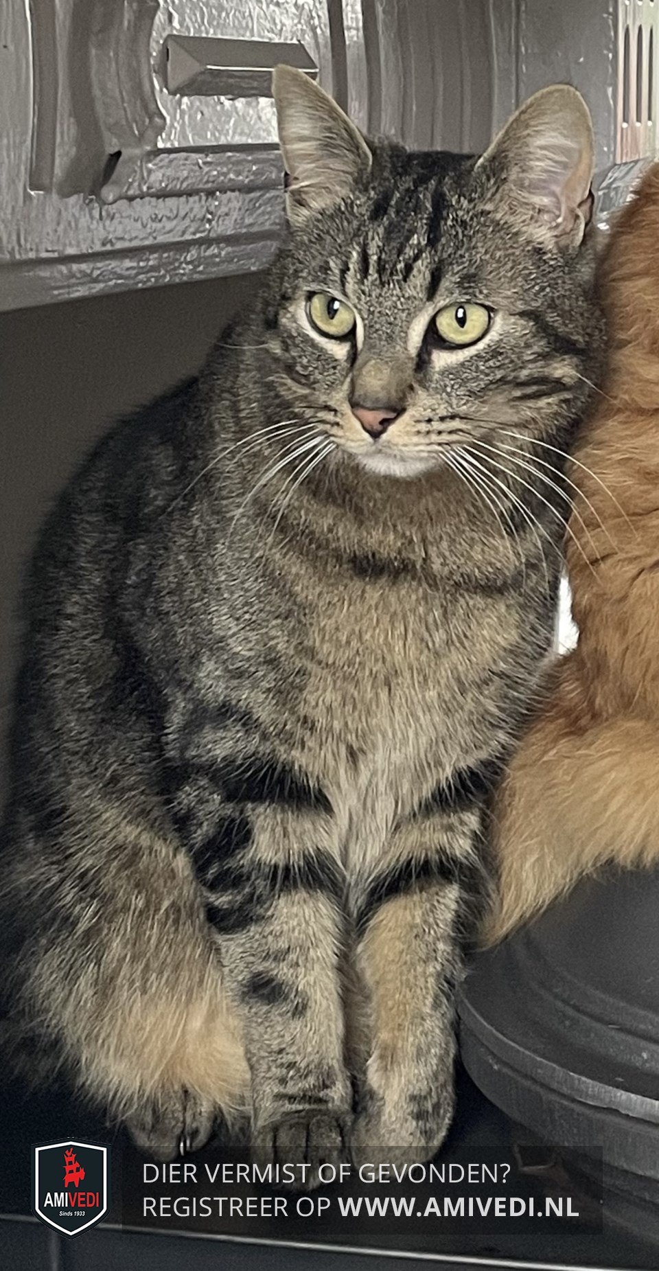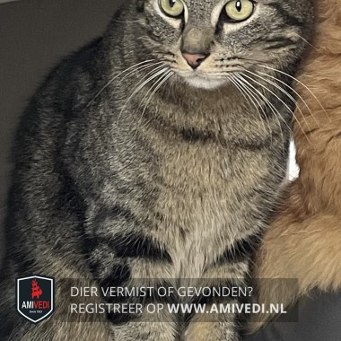 | Signalement | Bliksem is cypers bruin/zwart gestreept met wat lichtere kin en witte punt aan zijn staart. Hij loop heel licht mank. |