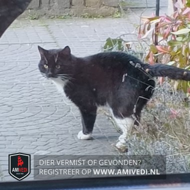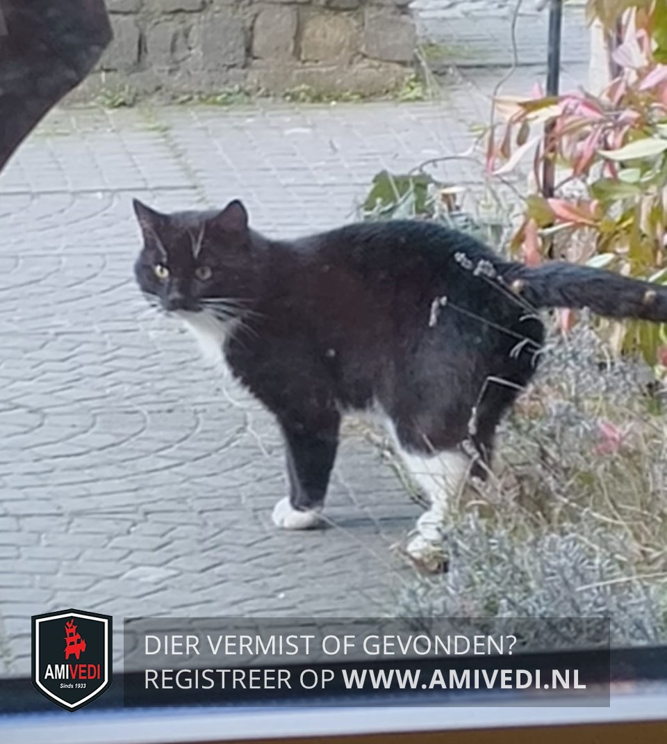 | Signalement | Europese korthaar kater, zwart met witte kin, witte bef, witte borst en witte buik. Voorpootjes witte voetjes, linker achterpoot witte laars. |