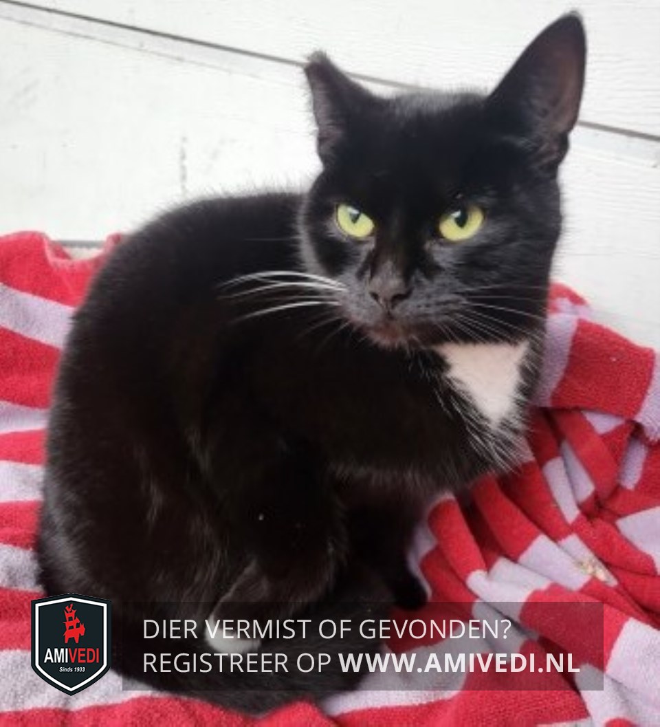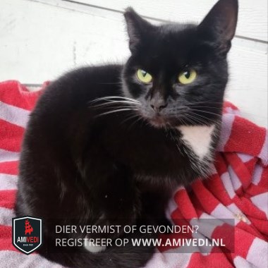 | Signalement | Moes is een zwarte poes met een wit befje. Witte pootjes waarvan bij 1 pootje 2 teentjes maar wit zijn. Haar oor is geknipt om aan te geven dat ze gesteriliseerd is. |