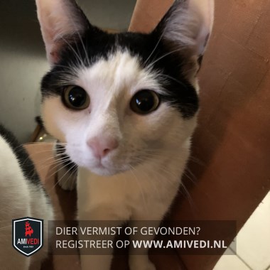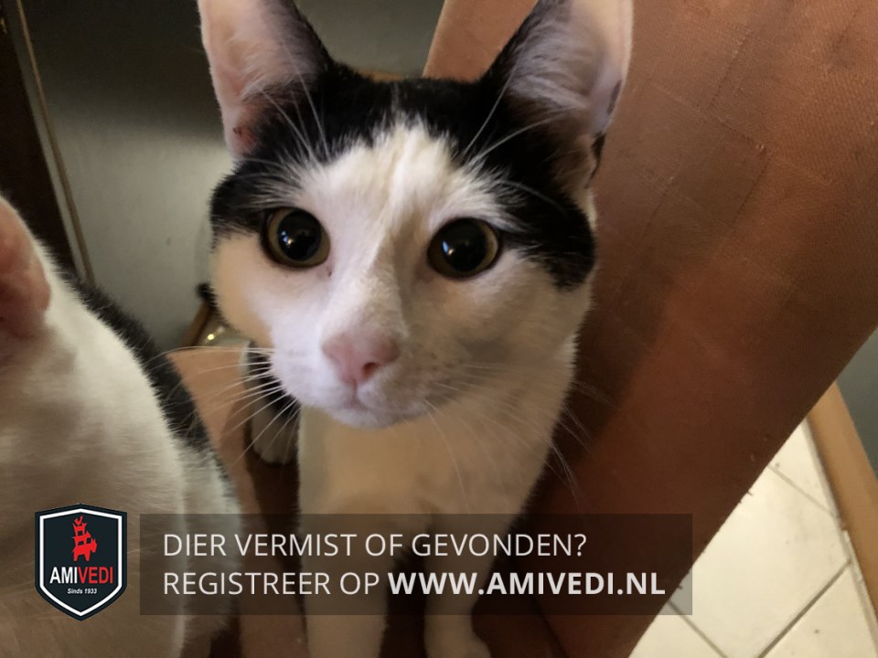 | Signalement | Zwart bovenop de kop, incl de oren. Witte snuit, bef, borst en buik. Beide voorpoten wit. Mager katje. |