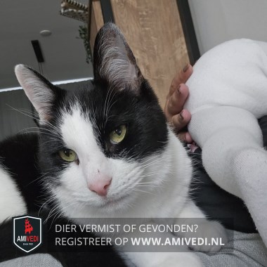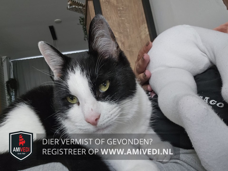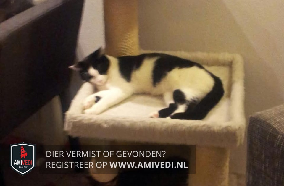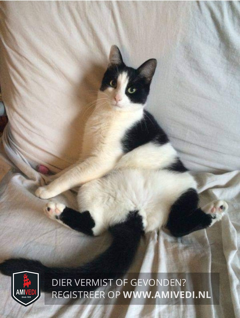 | Signalement | Witte kater met een zwart masker op, witte bles en een witte snuit. Witte onderkant en zwarte achterpootjes met witte teentjes. Zwart gevlekte rug en een zwarte staart. |