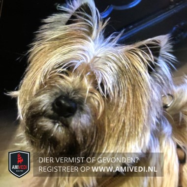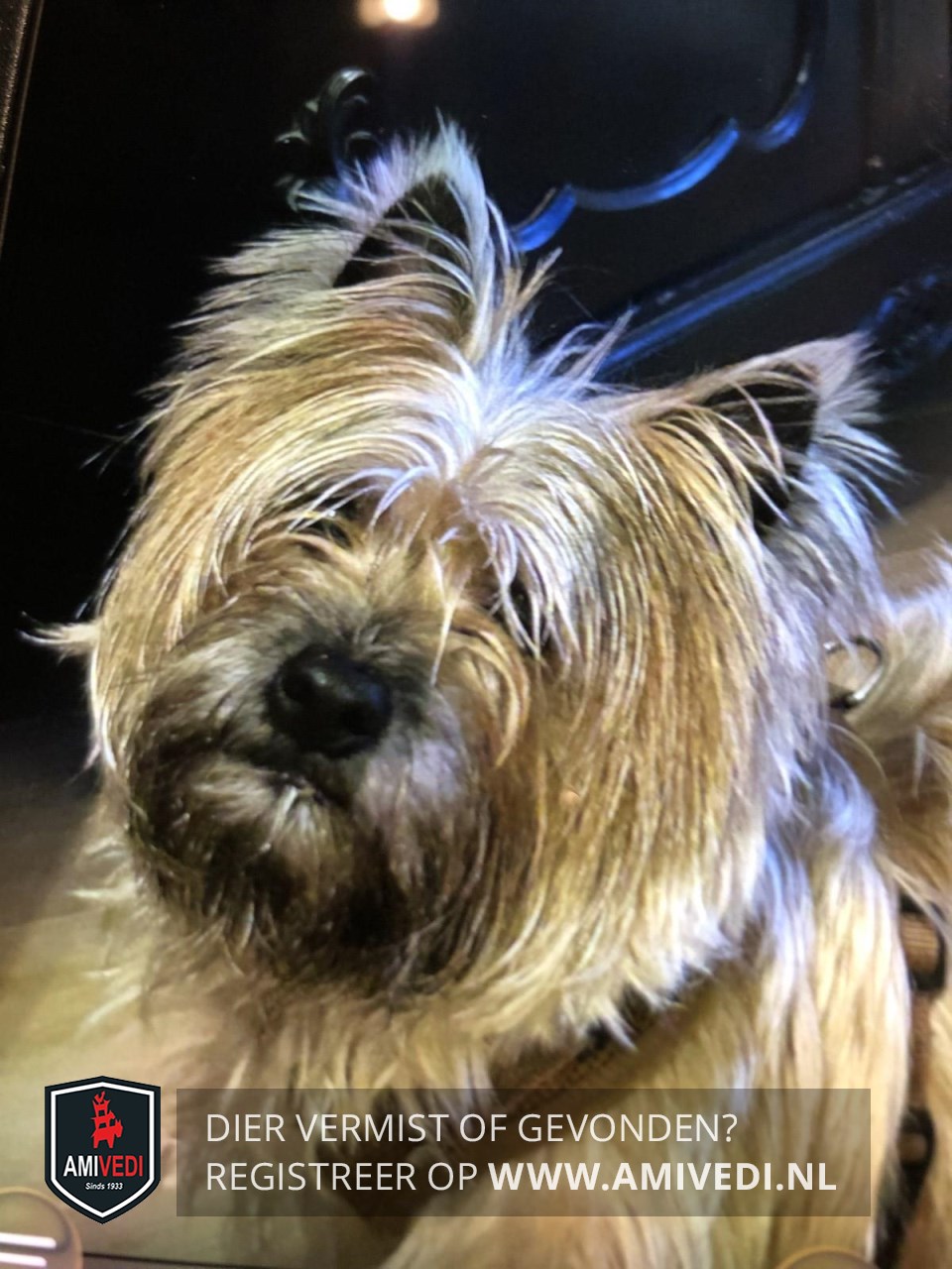 | Signalement | Cairnterrier, Beige-blond met een zwarte neus, rondom de snuit en kin grijs-zwart. |