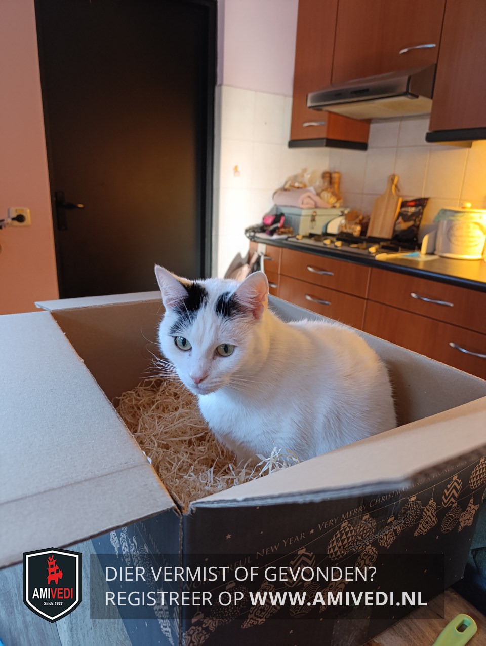 | Signalement | Wit met aan weerszijden op het kopje tegen elk oortje een zwarte vlek en zwarte vlek op 1 van de achterpoten. Verder geheel wit. |
