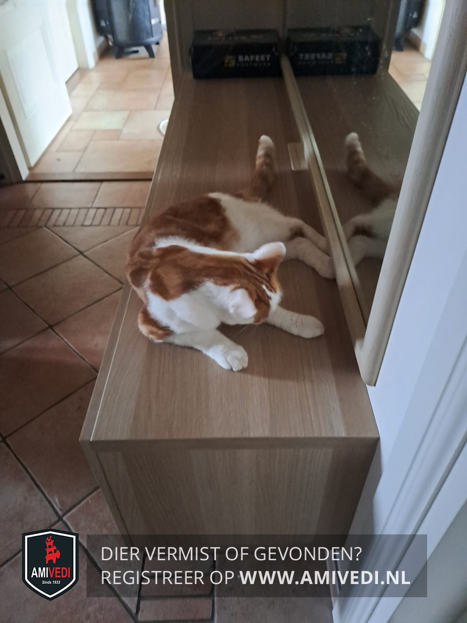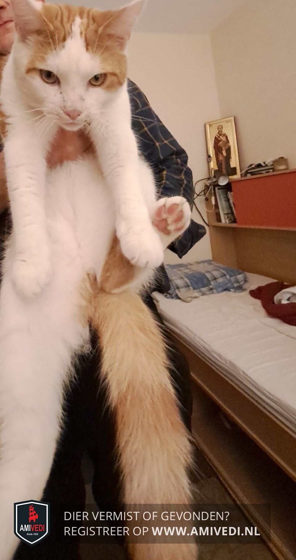 | Signalement | Wit met cypers rood. Kop wit, alleen tussen ogen en oren rood. Goudkleurige ogen. Rechteroor wit, linkeroor witte rand, rood oor. Brede rode baan van af bovenkant kop, loopt door naar rug. Daarnaast wit. t/m schouders. Keel, borst en buik wit. Voorpoten wit. Rug en flanken rood gestreept. Heupen wit. Achterpoten wit met rode vlek op linkerachterpoot (binnenkant). Rode gestreepte staart. |